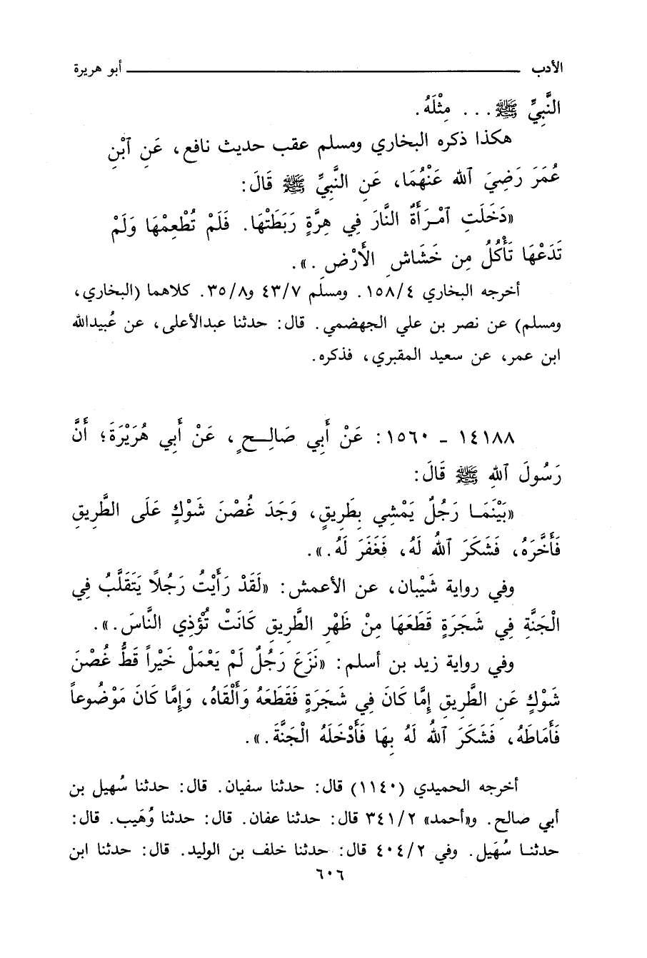 - وفي رواية: دَخَلَ عَبْدٌ الْجَنَّةَ بِغُصْنِ شَوْكٍ عَلَى ظَهْرِ طَرِيقِ الْمُسْلِمِينَ فَأَمَاطَهُ عَنْهُ.