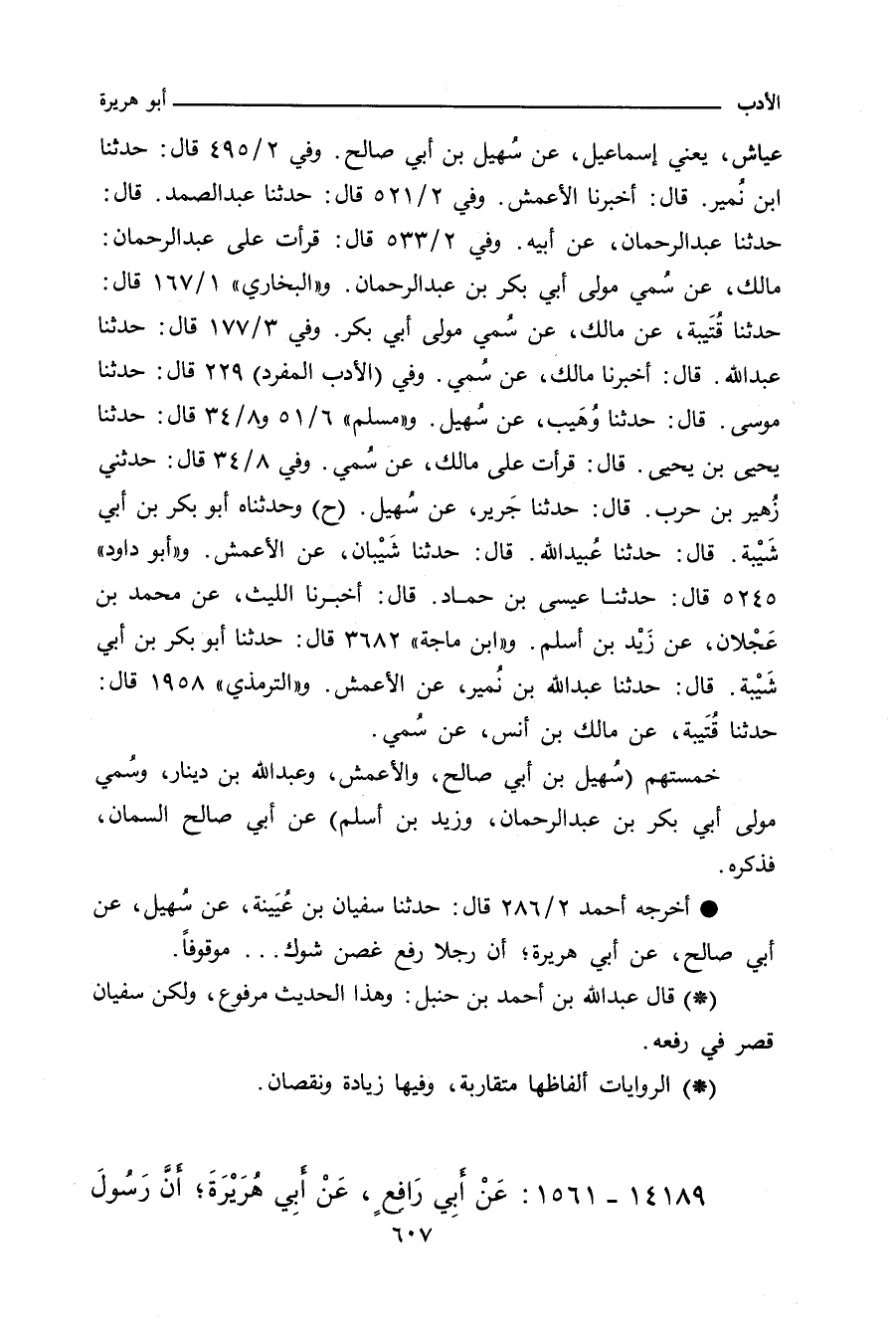 عياش، يعني إسماعيل، عن سُهيل بن أبي صالح. وفي ٢/ ٤٩٥ (١٠٤٣٦) قال: حدَّثنا ابن نُمير، قال: أخبرنا الأعمش. وفي ٢/ ٥٢١ (١٠٧٦٣) قال: حدَّثنا عبد الصمد، حدَّثنا عبد الرحمن، عن أبيه. وفي ٢/ ٥٣٣ (١٠٩٠٩) قال: قرأتُ على عبد الرحمن: مالك، عن سُمي مولى أبي بكر بن عبد الرحمن. و"البُخاري" ٦٥٢ قال: حدَّثنا قُتَيبة، عن مالك، عن سُمي مولى أبي بكر. وفي (٢٤٧٢) قال: حدَّثنا عبد الله، أخبرنا مالك، عن سُمي. وفي "الأدب المفرد" ٢٢٩ قال: حدَّثنا موسى، قال: حدَّثنا وُهَيب، عن سُهيل. و"مسلم" ٤٩٧٥ و ٦٧٦٢ قال: حدَّثنا يحيى بن يحيى، قال: قرأتُ على مالك، عن سُمي. وفي (٦٧٦٣) قال: حدثني زُهير بن حرب، حدَّثنا جَرير، عن سُهيل. وفي (٦٧٦٤) قال: حدثناه أبو بكر بن أبي شَيْبة، حدَّثنا عُبيد الله، حدَّثنا شَيْبان، عن الأعمش. و"أبو داود" ٥٢٤٥ قال: حدَّثنا عيسى بن حماد، أخبرنا الليث، عن محمد بن عَجْلان، عن زَيْد بن أسلم. و"ابن ماجة" ٣٦٨٢ قال: حدَّثنا أبو بكر بن أبي شَيْبة، حدَّثنا عبد الله بن نُمير، عن الأعمش. و"التِّرمِذي" ١٩٥٨ قال: حدَّثنا قُتَيبة، عن مالك بن أنس، عن سُمي. و"ابن حِبَّان" ٥٣٦ و ٥٣٧ قال: أخبرنا عمر بن سعيد بن سنان، قال: أخبرنا أحمد بن أبي بكر، عن مالك، عن سمي. وفي (٥٤٠) قال: أخبرنا إسماعيل بن داود بن وردان، قال: أخبرنا عيسى بن حماد، قال: أخبرنا الليث، عن ابن عجلان، عن زيد بن أسلم.