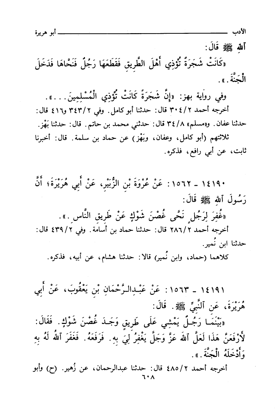 - وفي رواية: إِنَّ شَجَرَةً كَانَتْ تُؤْذِي الْمُسْلِمِينَ، فَجَاءَ رَجُلٌ فَقَطَعَهَا، فَدَخَلَ الْجَنَّةَ.