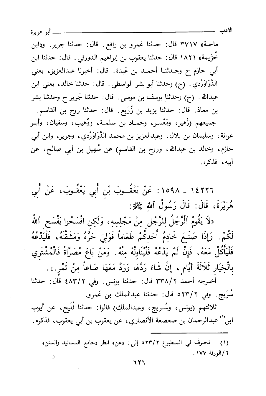 - لفظ سُرَيْج: لَا يَقُومُ الرَّجُلُ لِلرَّجُلِ مِنْ مَجْلِسِهِ، وَلَكِنْ أَفْسِحُوا يَفْسَحِ اللهُ لَكُمْ، وَإِذَا صَنَعَ خَادِمُ أَحَدِكُمْ طَعَامًا فَوَلِيَ حَرَّهُ وَمَشَقَّتَهُ فَلْيَدْعُهُ فَلْيَأْكُلْ مَعَهُ، فَإِنْ لَمْ يَدْعُهُ فَلْيُنَاوِلْهُ مِنْهُ، وَمَنْ بَاعَ مُصَرَّاةً فَالْمُشْتَرِي بِالْخِيَارِ ثَلَاثَةَ أَيَّامٍ، إِنْ شَاءَ رَدَّهَا وَرَدَّ مَعَهَا صَاعًا مِنْ تَمْرٍ.