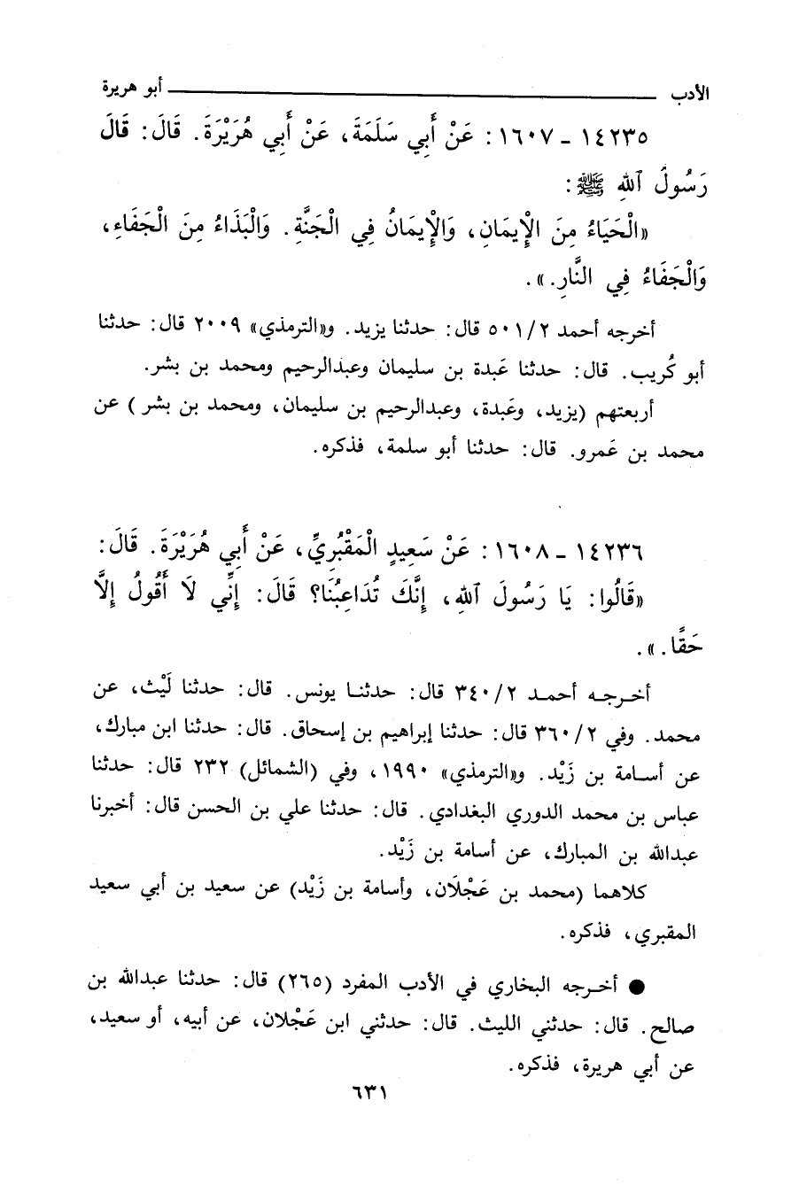 - أخرجه البخاري في "الأدب المفرد" ٢٦٥ قال: حدَّثنا عبد الله بن صالح، قال: حدثني الليث، قال: حدثني ابن عَجْلان، عن أبيه، أو سعيد، عَنْ أَبِى هُرَيْرَةَ؛