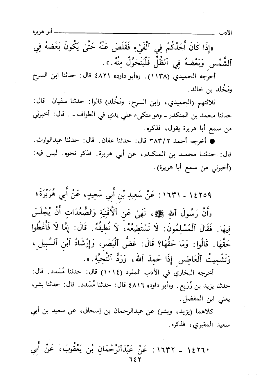 أَنّ رَسُولَ اللهِ صلى الله عليه وسلم نَهَى عَنِ الأَفْنِيَةِ وَالصُّعُدَاتِ أَنْ يُجْلَسَ فِيهَا، فَقَالَ الْمُسْلِمُونَ: لا نَسْتَطِيعُهُ، لا نُطِيقُهُ، قَالَ: أَمَّا لَا فَأَعْطُوا حَقَّهَا، قَالُوا: وَمَا حَقُّهَا؟ قَالَ: غَضُّ الْبَصَرِ، وَإِرْشَادُ ابْنِ السَّبِيلِ، وَتَشْمِيتُ الْعَاطِسِ إِذَا حَمِدَ اللهَ، وَرَدُّ التَّحِيَّةِ.