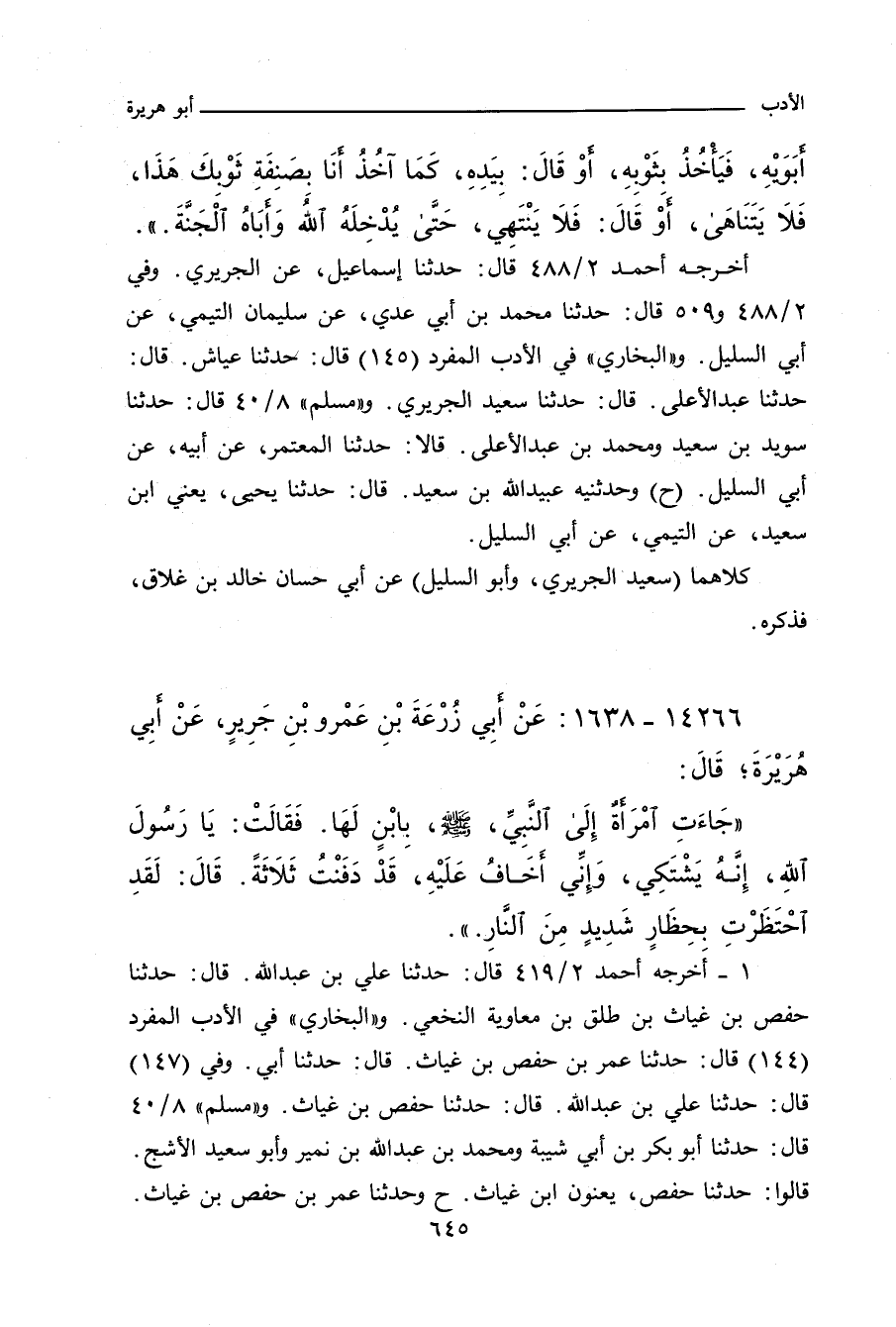 أخرجه ابن أَبي شَيْبَة ٣/ ٣٥٢ (١١٨٧٧) قال: حدَّثنا حفص بن غياث، عن طلق بن معاوية. و"أحمد" ٢/ ٤١٩ (٩٤٢٧) قال: حدَّثنا علي بن عبد الله، حدَّثنا حفص بن غياث بن طلق بن معاوية النخعي، قال: سمعتُ طَلْق بن مُعَاوية. وفي ٢/ ٥٣٦ (١٠٩٣٦) قال: حدَّثنا محمد بن عبد الله، حدَّثنا يحيى بن أيوب، من ولد جرير. و"البُخاري" في "الأدب المفرد" ١٤٤ قال: حدَّثنا عمر بن حفص بن غياث، قال: حدَّثنا أبي، عن طَلْق بن مُعَاوية. وفي (١٤٧) قال: حدَّثنا علي بن عبد الله، قال: حدَّثنا حفص بن غياث، قال: سمعتُ طَلْق بن مُعَاوية، هو جَدُّهُ. و"مسلم" ٦٧٩٦ قال: حدَّثنا أبو بكر بن أبي شيبة، ومحمد بن عبد الله بن نمير، وأبو سعيد الأشج، قالوا: حدثنا حفص، يعنون ابن غياث (ح) وحدثنا عمر بن حفص بن غياث،