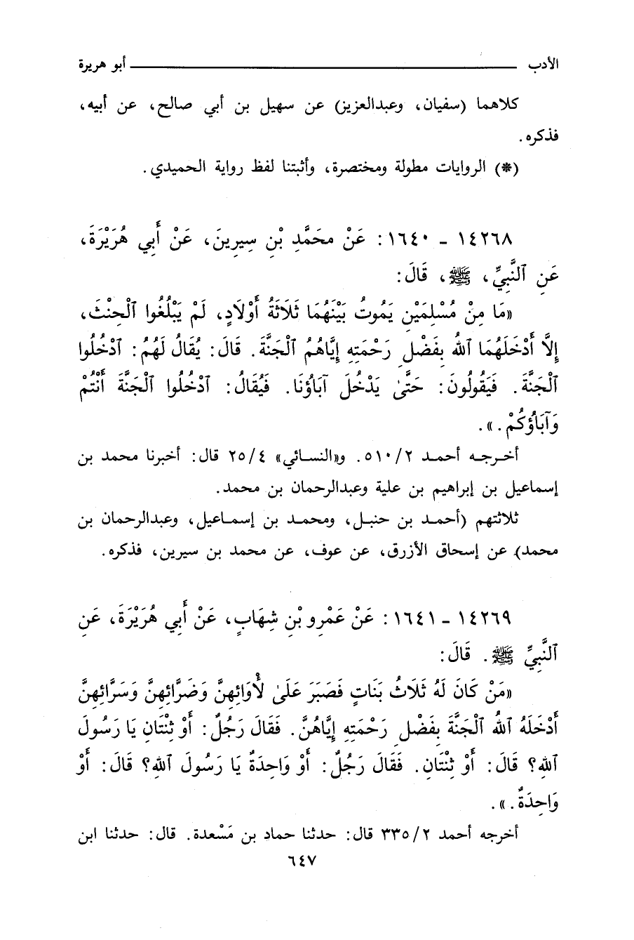 مَنْ كَانَ لَهُ ثَلَاثُ بَنَاتٍ فَصَبَرَ عَلَى لأْوَائِهِنَّ وَضَرَّائِهِنَّ وَسَرَّائِهِنَّ، أَدْخَلَهُ اللهُ الْجَنَّةَ بِفَضْلِ رَحْمَتِهِ إِيَّاهُنَّ، فَقَالَ رَجُلٌ: أَوِ اثْنَتَانِ يَا رَسُولَ اللهِ؟ قَالَ: أَوْ ثِنْتَانِ، فَقَالَ رَجُلٌ: أَوْ وَاحِدَةٌ يَا رَسُولَ اللهِ؟ قَالَ: أَوْ وَاحِدَةٌ.