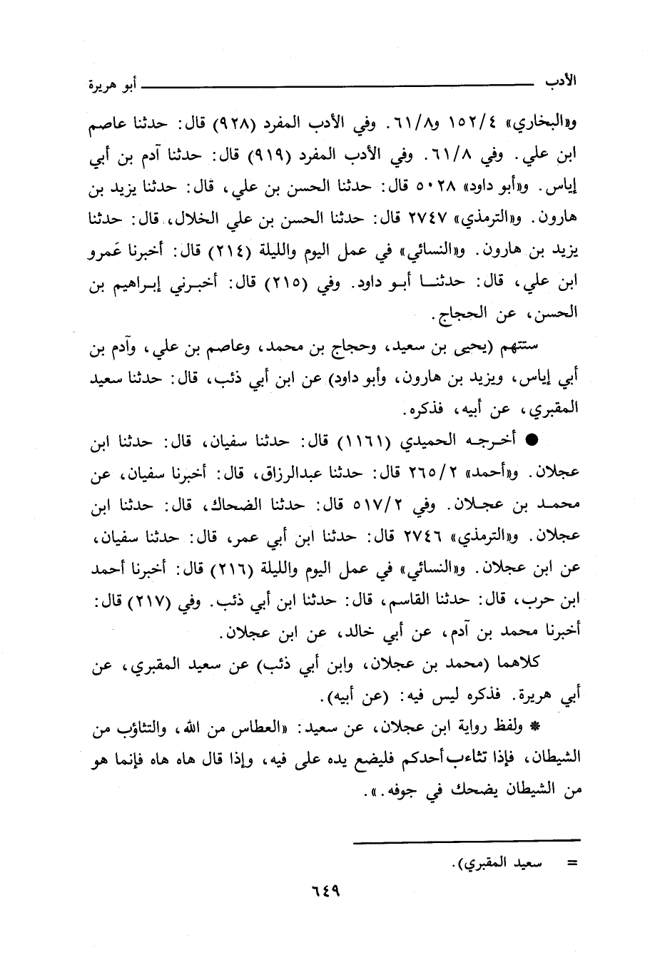 - أخرجه الحميدي (١١٦١) قال: حدَّثنا سفيان، قال: حدَّثنا ابن عجلان. و"أحمد" ٢/ ٢٦٥ (٧٥٨٩) قال: حدَّثنا عبد الرزاق، أخبرنا سفيان، عن محمد بن عجلان. وفي ٢/ ٥١٧ (١٠٧١٨) قال: حدَّثنا الضحاك، حدَّثنا ابن عجلان. و"ابن ماجة" ٩٦٨ قال: حدَّثنا محمد بن الصباح، أنبأنا حفص بن غياث، عن عبد الله بن سعيد المقبري. و"التِّرمِذي" ٢٧٤٦ قال: حدَّثنا ابن أبي عمر، حدَّثنا سفيان، عن ابن عجلان. و"النَّسائي" في "الكبرى" ٩٩٧٣ قال: أخبرنا أحمد بن حرب، قال: حدَّثنا القاسم، قال: حدَّثنا ابن أبي ذئب. وفي (٩٩٧٤) قال: أخبرنا محمد بن آدم، عن أبي خالد، عن ابن عجلان. و"أبو يَعْلَى" ٦٦٢٧ قال: حدَّثنا عُبَيْد الله بن عُمَر الجُشَمِي، حدَّثنا يزيد بن زُرَيْع، حدَّثنا عَبْد الرَّحْمان بن إسحاق. و"ابن خزيمة" ٩٢١ قال: حدَّثنا محمد بن العلاء بن كريب، حدَّثنا أبو خالد، عن محمد بن عجلان. وفي (٩٢٢) قال: حدَّثنا الصنعاني محمد بن عبد الأعلى، حدَّثنا بشر، يعني ابن المفضل، حدَّثنا عبد الرحمن وهو ابن إسحاق. و"ابن حِبَّان" ٥٩٨ قال: أخبرنا مُحَمد بن إسحاق بن سَعِيد السَّعْدِي، قال: حدَّثنا علي بن خَشْرَم، قال: حدَّثنا عِيسَى بن يُونُس، عن ابن أبي ذِئْب. وفي (٢٣٥٨) قال: أخبرنا الفَضْل بن الحُبَاب، قال: حدَّثنا إبراهيم بن بَشَّار الرَّمَادي، قال: حدَّثنا سُفْيَان عن ابن عَجْلان.