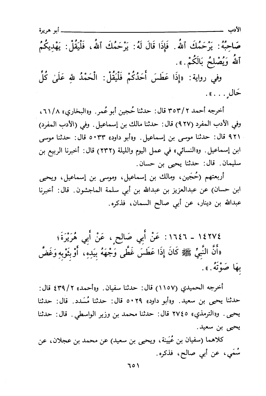 أخرجه الحميدي (١١٥٧) قال: حدَّثنا سفيان. و"أحمد" ٢/ ٤٣٩ (٩٦٦٠) قال: حدَّثنا يحيى بن سعيد. و"أبو داود" ٥٠٢٩ قال: حدَّثنا مُسَدَّد، حدَّثنا يحيى. و"التِّرمِذي" ٢٧٤٥ قال: حدَّثنا محمد بن وزير الواسطي، حدَّثنا يحيى بن سعيد. و"أبو يَعْلَى" ٦٦٦٣ قال: حدَّثنا إسحاق، حدَّثنا خالد بن الحارث.