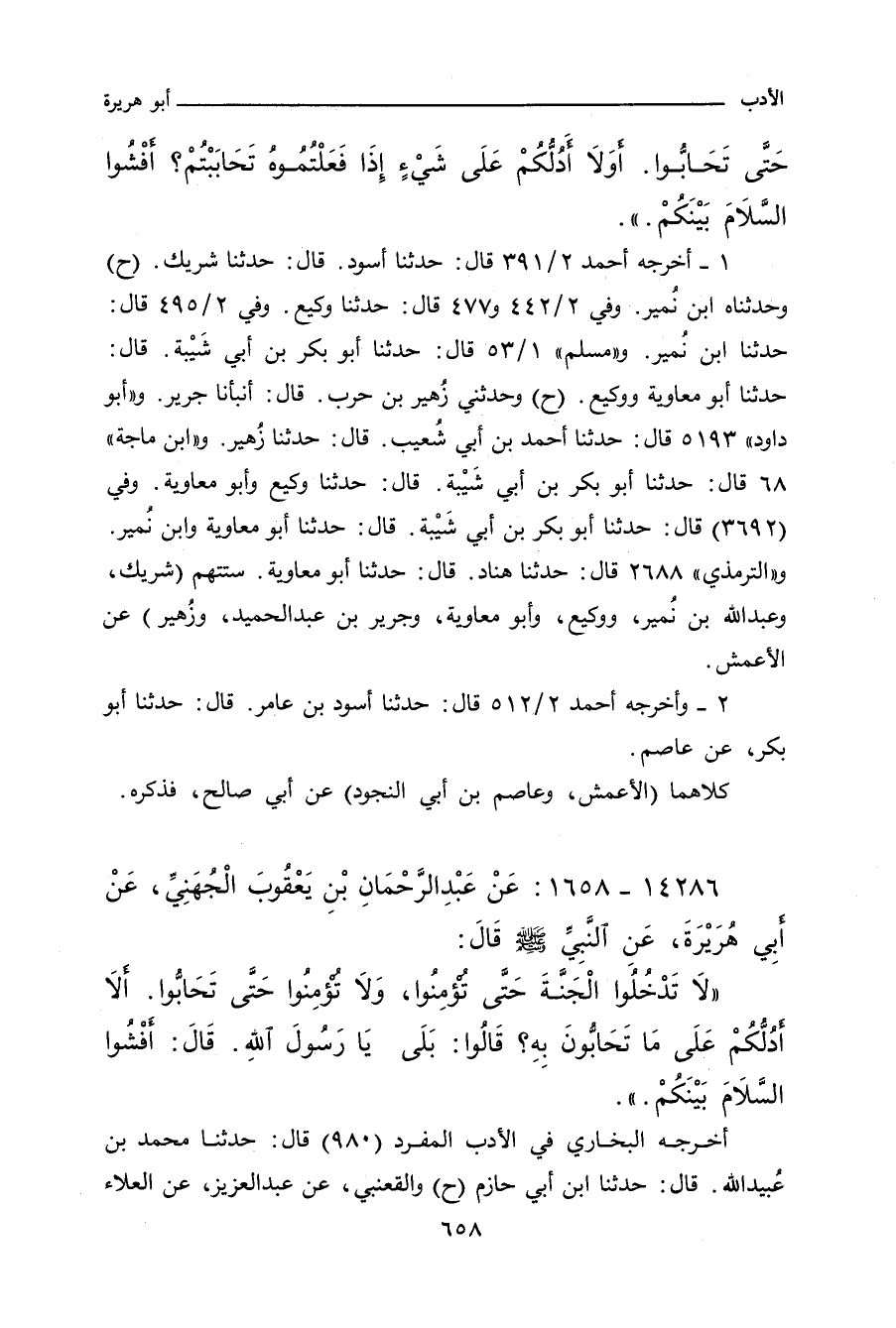 - وفي رواية: لَا تَدْخُلُونَ الْجَنَّةَ حَتَّى تُؤْمِنُوا، وَلَا تُؤْمِنُونَ حَتَّى تَحَابُّوا، أَلَا أَدُلُّكُمْ عَلَى رَأْسِ ذَلِكَ، أَوْ مِلَاكِ ذَلِكَ؟ أَفْشُوا السَّلَامَ بَيْنَكُمْ.