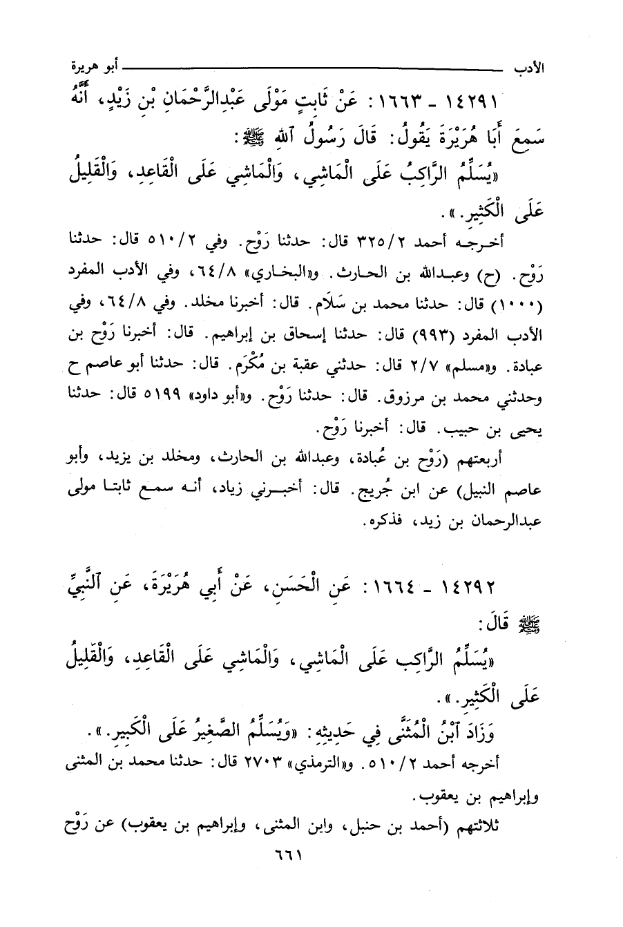 يُسَلِّمُ الرَّاكِبُ عَلَى الْمَاشِي، وَالْمَاشِي عَلَى الْقَاعِدِ، وَالْقَلِيلُ عَلَى الْكَثِيرِ.
