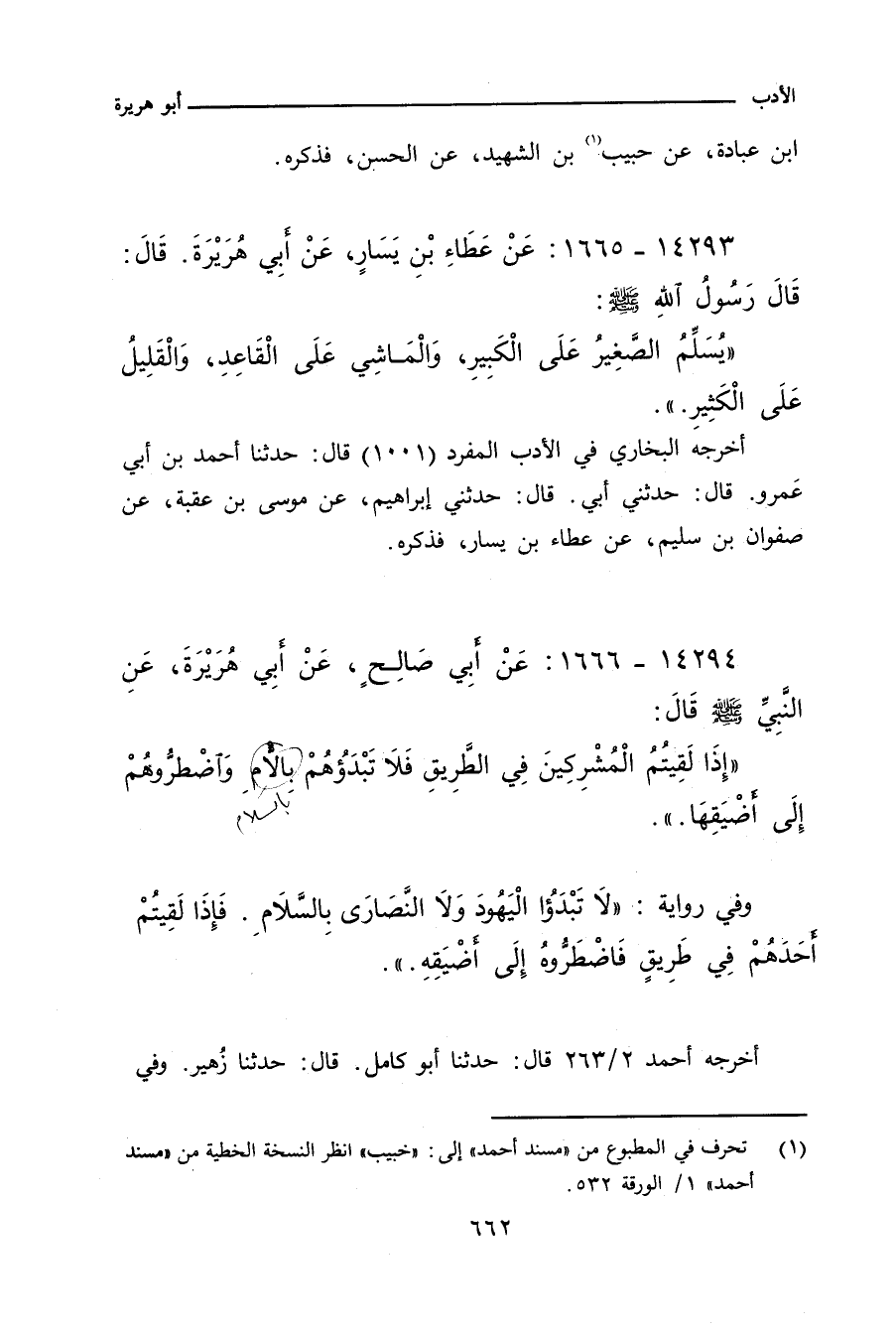 - وفي رواية: عَنْ سُهَيْلِ بْنِ أَبِي صَالِحٍ، قَالَ: خَرَجْتُ مَعَ أَبِي إِلَى الشَّامِ، فَجَعَلُوا يَمُرُّونَ بِصَوَامِعَ فِيهَا نَصَارَى فَيُسَلِّمُونَ عَلَيْهِمْ، فَقَالَ أَبِي: لَا تَبْدَءُوهُمْ بِالسَّلَامِ، فَإِنَّ أَبَا هُرَيْرَةَ حَدَّثَنَا عَنْ رَسُولِ اللهِ صلى الله عليه وسلم، قَالَ: