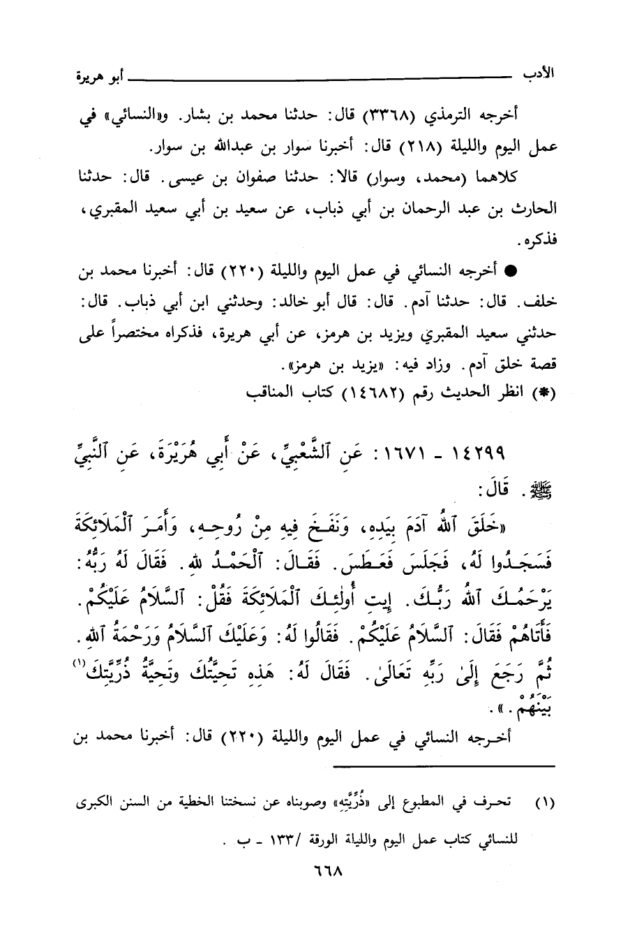 خَلَقَ اللَّهُ ادم بيدِهِ، وَنَفَخَ فِيهِ مِنْ رُوحِهِ، وَأمَرَ الْمَلائِكه فَسَجَدُوا لَهُ، فَجَلَسَ فَعَطَسَ. فَقال: الْحَمْدُ لله. فَقال: لَهُ رَبّه يَرْحَمُكَ الله رَبُّكَ. إِيتِ أولئِكَ الْمَلائِكَةَ فَقُلْ: السَّلَامُ عَلَيْكُمْ فَأتَاهُمْ فَقال: السَّلامُ عَلَيْكُمْ. فَقَالُوا لَهُ: وَعَلَيْكَ السَّلامُ وَرَحْمَةُ الله ثُمَّ رَجَعَ إِلَى رَبِّهِ تَعَالَى. فَقال: لَهُ: هَذِهِ تَحِيَّتُكَ وتَحِيَّةُ ذُرِّيَّتِكَ بَيْنهُمْ.