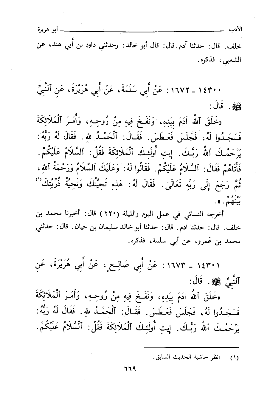 النبي صلى الله عليه وسلم. قَالَ: خَلَقَ الله ادم بيدِهِ، وَنَفَخَ فِيهِ مِنْ رُوحِهِ، وَأَمَرَ الْمَلَائِكَةَ فسجَدُوا لَهُ، فَجَلَسَ فًعَطَسَ. فَقال: الْحَمْدُ لله. فَقال: لَهُ رَبهُ: يَرْحمكَ الله رَبُّكَ. إِتِ أولئِكَ الْمَلائِكَةَ فَقُلْ: الْسَّلامُ عَلَيْكُمْ.