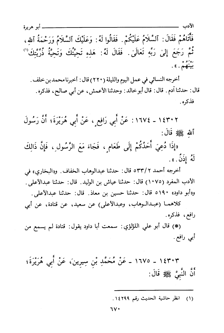 ١٤٣٠٢ - عَنْ أَبِي رَافِعٍ، عَنْ أَبِي هُرَيْرَةَ، أَنَّ رَسُولَ اللهِ صلى الله عليه وسلم قَالَ: