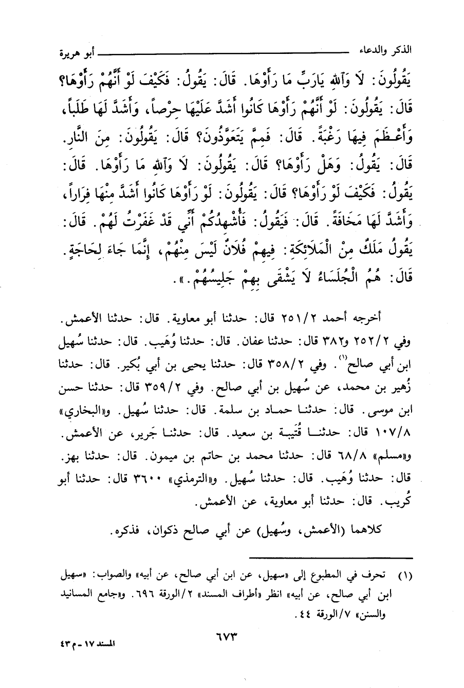أخرجه أحمد ٢/ ٢٥٢ (٧٤٢٠) و ٢/ ٣٨٢ (٨٩٦٠) قال: حدَّثنا عفان، حدَّثنا وُهَيب، حدَّثنا سُهيل بن أبي صالح. وفي ٢/ ٣٥٨ (٨٦٨٩) قال: حدَّثنا يحيى بن أبي بُكير، حدَّثنا زُهير بن محمد، عن سُهيل بن أبي صالح. وفي ٢/ ٣٥٩ (٨٦٩٠) قال: حدَّثنا حسن بن موسى، حدَّثنا حماد بن سلمة، حدَّثنا سُهيل. و"البُخاري" ٦٤٠٨ قال: حدَّثنا قُتَيبة بن سعيد، حدَّثنا جَرِير، عن الأعمش. و"مسلم" ٦٩٣٨ قال: حدَّثنا محمد بن حاتم بن ميمون، حدَّثنا بهز، حدَّثنا وُهَيب، حدَّثنا سُهيل. و"ابن حِبَّان" ٨٥٦ قال: أخبرنا مُحَمد بن أحمد بن أبي عَوْن الرَّيَّاني، قال: حدَّثنا مُحَمد بن عَبْد رَبِّه، قال: حدَّثنا الفُضَيْل بن عِيَاض، عن الأعمش. وفي (٨٥٧) قال: أخبرنا عَبْد الله بن مُحَمد الأَزْدِي، قال: حدَّثنا إسحاق بن إبراهيم، قال: أخبرنا جَرِير، عن الأعمش.