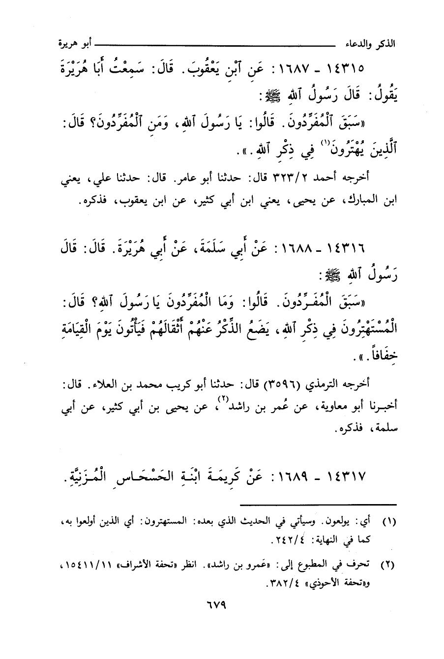 سَبَقَ الْمُفَرِّدُونَ، قَالُوا: يَا رَسُولَ اللهِ، وَمَنِ الْمُفَرِّدُونَ؟ قَالَ: الَّذِينَ يُهْتَرُونَ فِي ذِكْرِ اللهِ.