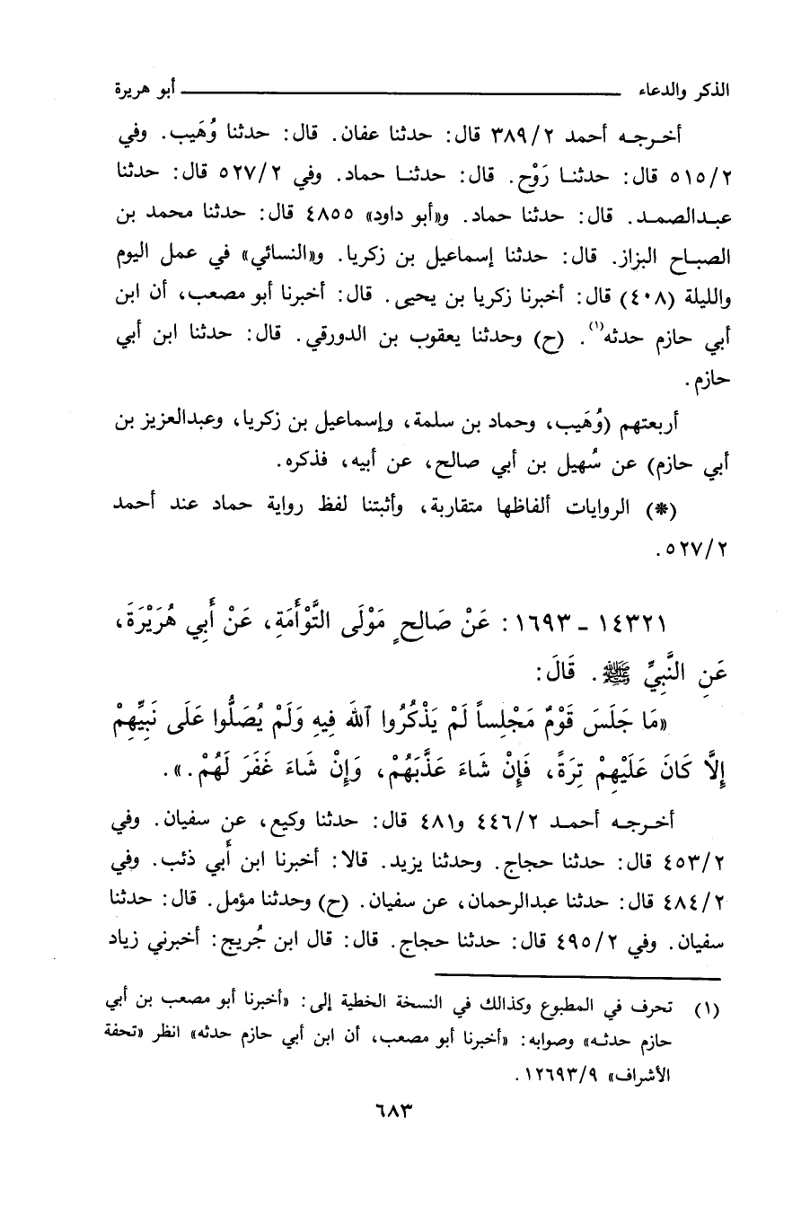 أخرجه أحمد ٢/ ٣٨٩ (٩٠٤٠) قال: حدَّثنا عفان، حدَّثنا وُهَيب. وفي ٢/ ٥١٥ (١٠٦٩١) قال: حدَّثنا رَوْح، حدَّثنا حماد. وفي ٢/ ٥٢٧ (١٠٨٣٧) قال: حدَّثنا عبد الصمد، حدَّثنا حماد. و"أبو داود" ٤٨٥٥ قال: حدَّثنا محمد بن الصَّبَّاح البَزَّاز، حدَّثنا إسماعيل بن زكريا. و"النَّسائي" في "الكبرى" ١٠١٦٩ قال: أخبرنا زكريا بن يحيى، أخبرنا أبو مصعب، أن ابن أبي حازم حدَّثه (ح) وحدثنا يعقوب بن الدورقي، حدَّثنا ابن أبي حازم. و"ابن حِبَّان" ٥٩٠ قال: أخبرنا أبو عُمَارة، أحمد بن عُمَارة الحافظ، بِالْكَرْج، قال: حدَّثنا أحمد بن عِصَام بن عَبْد المجيد، قال: حدَّثنا مُؤَمَّل بن إسماعيل، قال: حدَّثنا سُفْيَان.