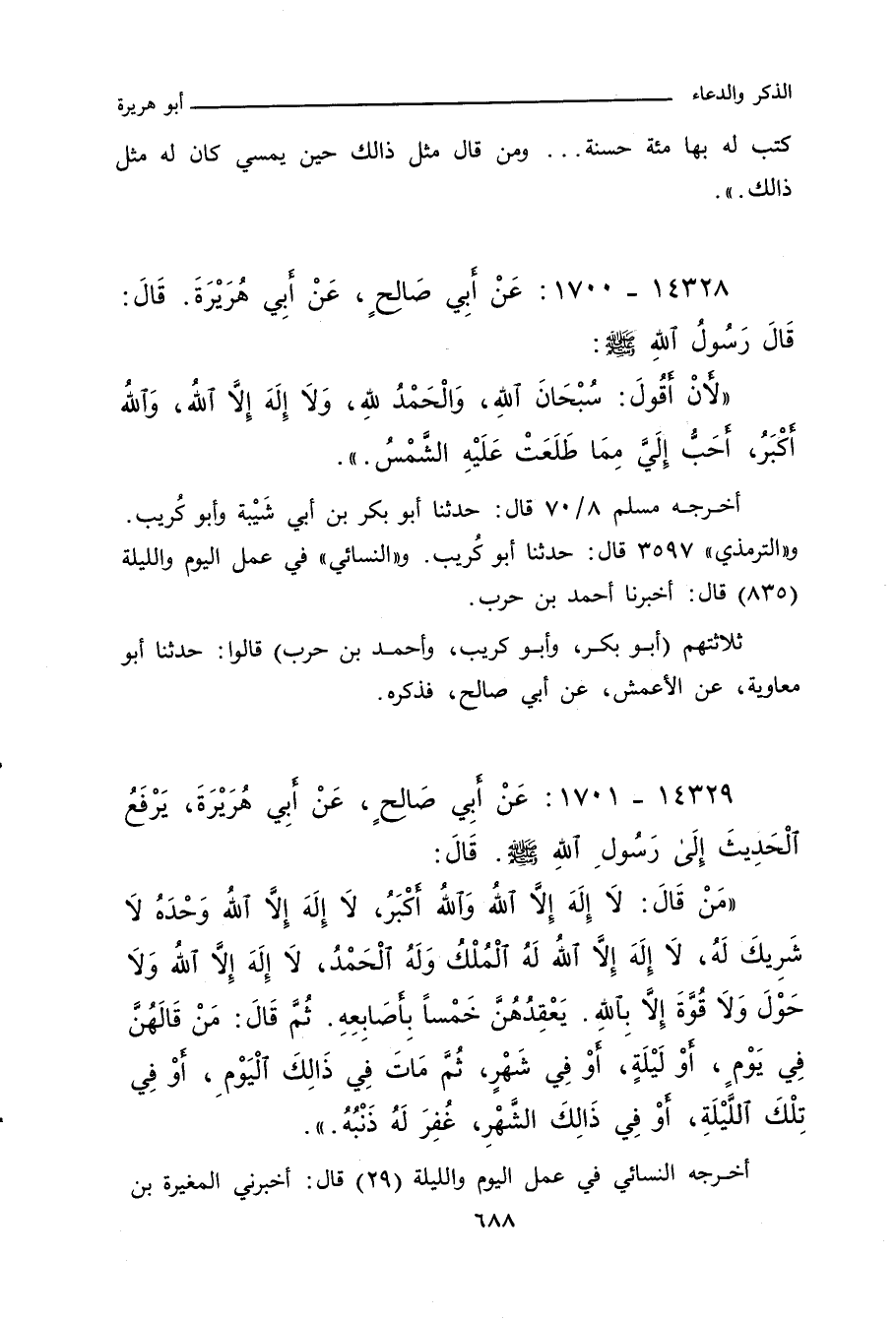 لأَنْ أَقُولَ: سُبْحَانَ اللهِ، وَالْحَمْدُ ِللهِ، وَلَا إِلَهَ إِلَاّ اللهُ، وَاللهُ أَكْبَرُ، أَحَبُّ إِلَيَّ مِمَّا طَلَعَتْ عَلَيْهِ الشَّمْسُ.