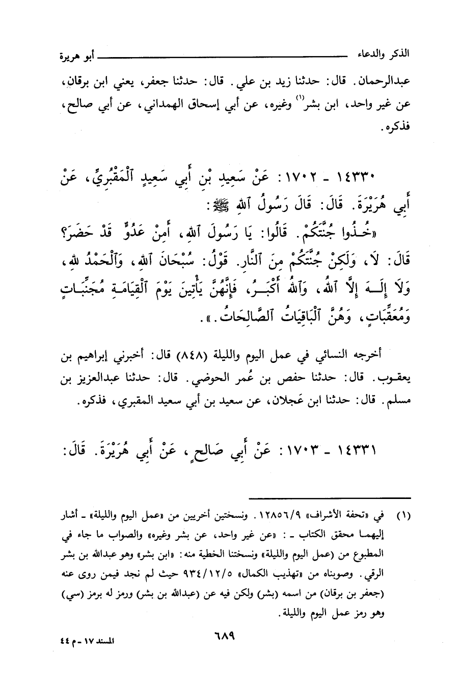 عبد الرحمن، قال: حدَّثنا زيد بن علي، قال: حدَّثنا جعفر، يعني ابن برقان، عن غير واحد، ابن بشر وغيره، عن أبي إسحاق الهمداني، عن أبي صالح، فذكره.