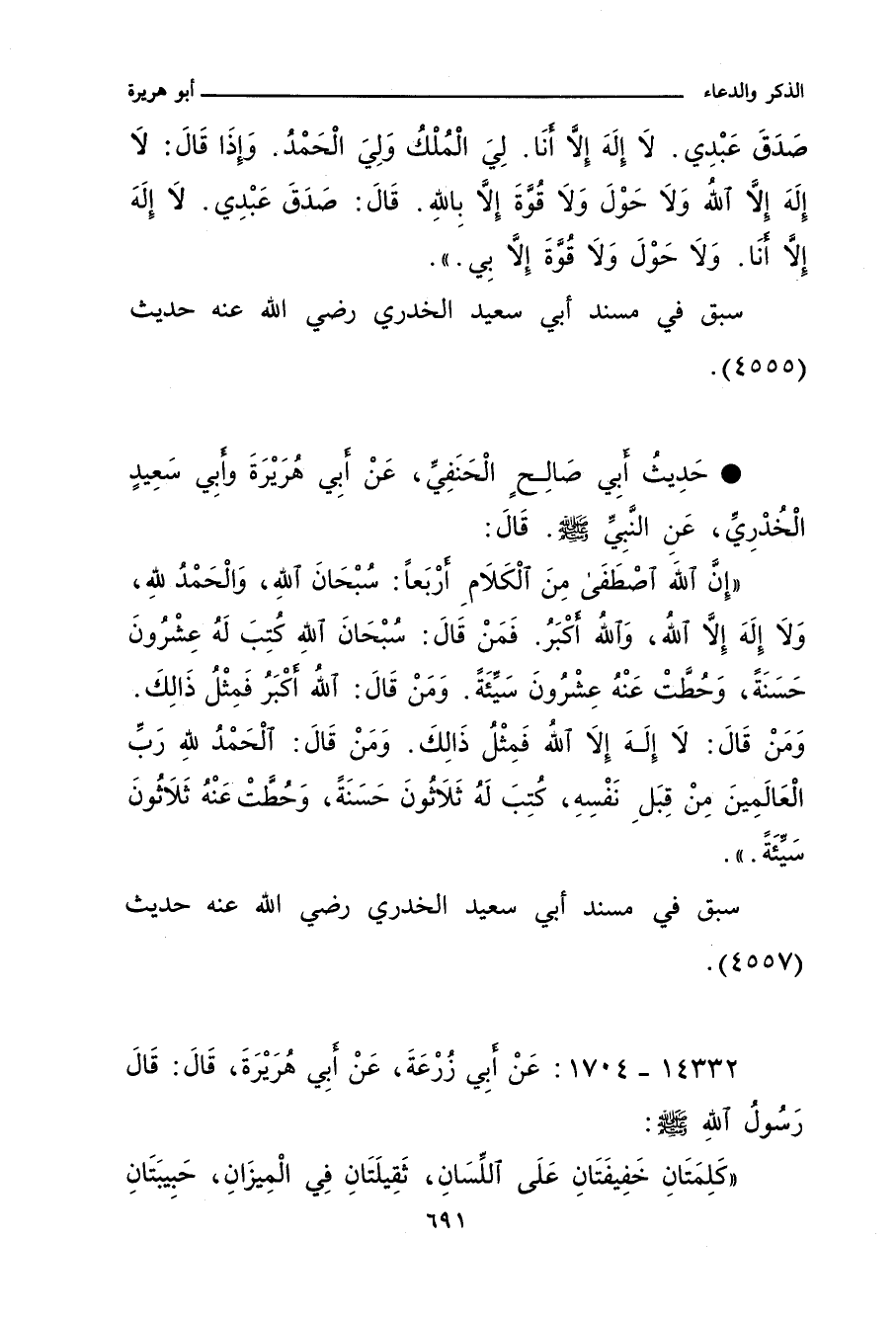 صَدَقَ عَبْدِي. لا إِلَهَ إِلأ أنَا. لِيَ الْمُلْكُ وَلِيَ الْحَمْدُ. وَإذَا قَالَ: لا إِلَهَ إِلا الله وَلا حَوْلَ وَلا قُوَّةَ إِلا بِالله. قَالَ: صَدَقَ عَبْدِي. لا إِلَهَ إِلا أنَا. وَلا حَوْلَ وَلا قُوَّةَ إِلا بِي. (.