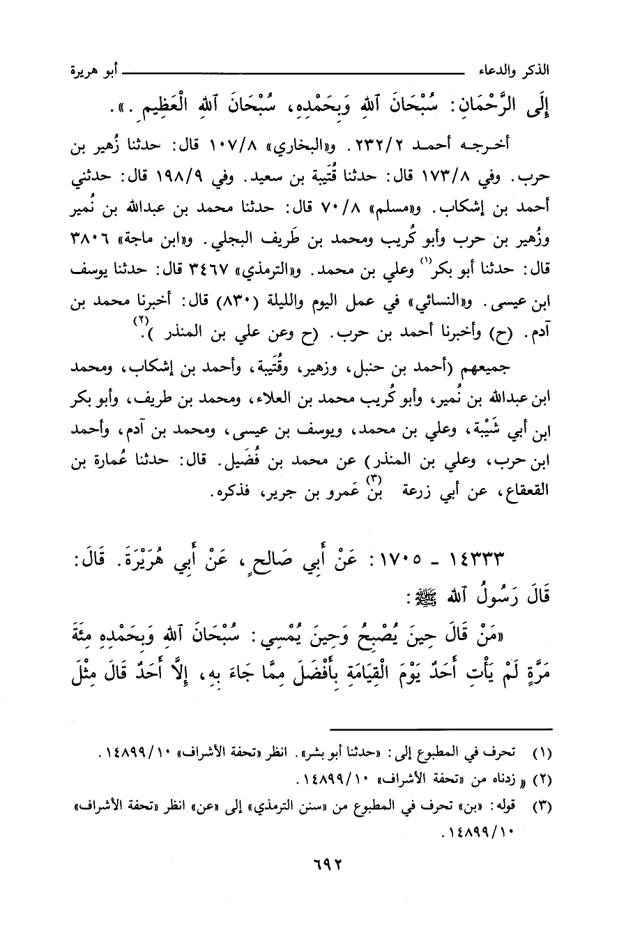 جميعهم (أبو بكر بن أبي شَيْبة، وأحمد بن حنبل، وزهير بن حرب، وقُتَيبة، وأحمد بن إشكاب، ومحمد بن عبد الله بن نُمير، وأبو كُريب، محمد بن العلاء، ومحمد بن طريف، وعلي بن محمد، ويوسف بن عيسى، ومحمد بن آدم، وأحمد بن حرب، وعلي بن المنذر، وحُسَيْن بن الأَسْود، والعَبَّاس بن يزيد) عن محمد بن فُضَيل، عن عمارة بن القعقاع، عن أبي زرعة بن عَمْرو بن جرير، فذكره.