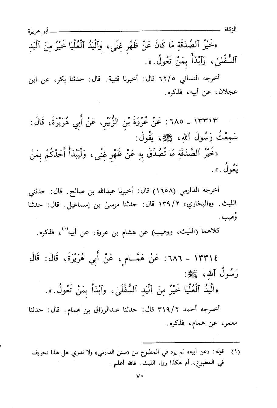 أخرجه الدارمي (١٦٥١) قال: أخبرنا عبد الله بن صالح، قال: حدثني الليث. و"البُخاري" ٢/ ١٣٩ (١٤٢٨) قال: حدَّثنا موسى بن إسماعيل، عن وهيب.