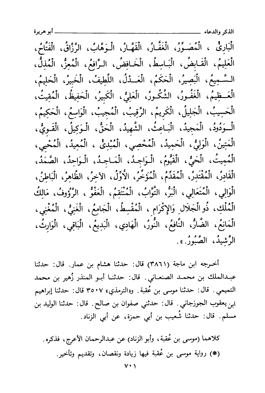 - وفي رواية: إِنَّ للهِ تِسْعَةً وَتِسْعِينَ اسْمًا، مِئَةً إِلَاّ وَاحِدًا، إِنَّهُ وِتْرٌ يُحِبُّ الْوِتْرَ، مَنْ أَحْصَاهَا دَخَلَ الْجَنَّةَ، هُوَ اللهُ الَّذِي لَا إِلَهَ إِلَاّ هُوَ، الرَّحْمَانُ، الرَّحِيمُ، الْمَلِكُ، الْقُدُّوسُ، السَّلامُ، الْمُؤْمِنُ، الْمُهَيْمِنُ، الْعَزِيزُ، الْجَبَّارُ، الْمُتَكَبِّرُ، الْخَالِقُ، الْبَارِئُ، الْمُصَوِّرُ، الْغَفَّارُ، الْقَهَّارُ، الْوَهَّابُ، الرَّزَّاقُ، الْفَتَّاحُ، الْعَلِيمُ، الْقَابِضُ، الْبَاسِطُ، الْخَافِضُ، الرَّافِعُ، الْمُعِزُّ، الْمُذِلُّ، السَّمِيعُ، الْبَصِيرُ، الْحَكَمُ، الْعَدْلُ، اللَّطِيفُ، الْخَبِيرُ، الْحَلِيمُ، الْعَظِيمُ، الْغَفُورُ، الشَّكُورُ، الْعَلِيُّ، الْكَبِيرُ، الْحَفِيظُ، الْمُقِيتُ، الْحَسِيبُ، الْجَلِيلُ، الْكَرِيمُ، الرَّقِيبُ، الْوَاسِعُ، الْحَكِيمُ، الْوَدُودُ، الْمَجِيدُ، الْمُجِيبُ، الْبَاعِثُ، الشَّهِيدُ، الْحَقُّ، الْوَكِيلُ، الْقَوِيُّ، الْمَتِينُ، الْوَلِيُّ، الْحَمِيدُ، الْمُحْصِي، الْمُبْدِئُ، الْمُعِيدُ، الْمُحْيِي، الْمُمِيتُ، الْحَيُّ، الْقَيُّومُ، الْوَاجِدُ، الْمَاجِدُ، الْوَاحِدُ، الأَحَدُ، الصَّمَدُ، الْقَادِرُ، الْمُقْتَدِرُ، الْمُقَدِّمُ، الْمُؤَخِّرُ، الأَوَّلُ، الآخِرُ، الظَّاهِرُ، الْبَاطِنُ، الْمُتَعَالِ، الْبَرُّ، التَّوَّابُ