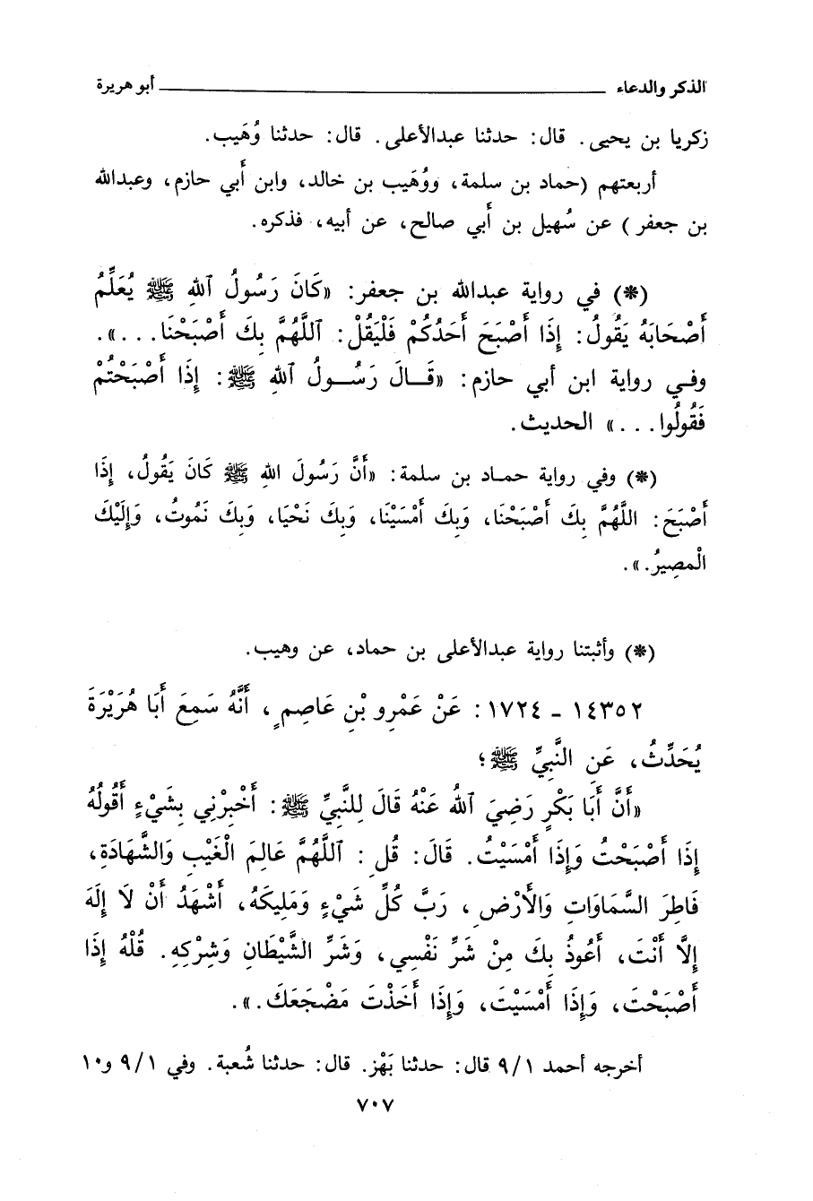 - وفي رواية: إِنَّ أَبَا بَكْرٍ، رَضِيَ اللهُ عَنْهُ، قَالَ: يَا رَسُولَ اللهِ، أَخْبَرَنِي بِشَيْءٍ أَقُولُهُ إِذَا أَصْبَحْتُ، وَإِذَا أَمْسَيْتُ، قَالَ: قُلِ: اللَّهُمَّ عَالِمَ الْغَيْبِ وَالشَّهَادَةِ، فَاطِرَ السَّماوَاتِ وَالأَرْضِ، رَبَّ كُلِّ شَيْءٍ وَمَلِيكَهُ، أَشْهَدُ أَنْ لَا إِلَهَ إِلَاّ أَنْتَ، أَعُوذُ بِكَ مِنْ شَرِّ نَفْسِي، وَمِنْ شَرِّ الشَّيْطَانِ وَشِرْكِهِ، وَأَنْ أَقْتَرِفَ عَلَى نَفْسِي سُوءًا أَوْ أَجُرَّهُ إِلَى مُسْلِمٍ، قُلْهُ إِذَا أَصْبَحْتَ، وَإِذَا أَمْسَيْتَ، وَإِذَا أَخَذْتَ مَضْجَعَكَ.