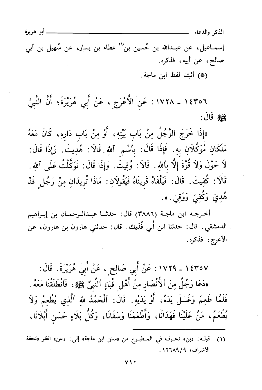 إِذَا خَرَجَ الرَّجُلُ مِنْ بَابِ بَيْتِهِ، أَوْ مِنْ بَابِ دَارِهِ، كَانَ مَعَهُ مَلَكَانِ مُوَكَّلَانِ بِهِ، فَإِذَا قَالَ: بِسْمِ اللهِ، قَالَا: هُدِيتَ، وَإِذَا قَالَ: لَا حَوْلَ وَلَا قُوَّةَ إِلَاّ بِاللهِ، قَالَا: وُقِيتَ، وَإِذَا قَالَ: تَوَكَّلْتُ عَلَى اللهِ، قَالَا: كُفِيتَ، قَالَ: فَيَلْقَاهُ قَرِينَاهُ فَيَقُولَانِ: مَاذَا تُرِيدَانِ مِنْ رَجُلٍ قَدْ هُدِيَ وَكُفِيَ وَوُقِيَ.