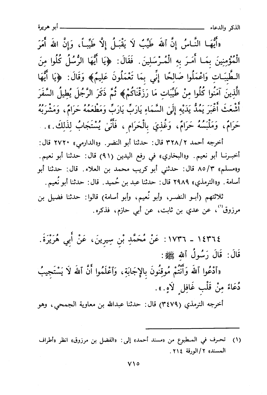 أَيُّهَا النَّاسُ، إِنَّ اللهَ طَيِّبٌ لَا يَقْبَلُ إِلَاّ طَيِّبًا، وَإِنَّ اللهَ أَمَرَ الْمُؤْمِنِينَ بِمَا أَمَرَ بِهِ الْمُرْسَلِينَ، فَقَالَ: (يَا أَيُّهَا الرُّسُلُ كُلُوا مِنَ الطَّيِّبَاتِ وَاعْمَلُوا صَالِحًا إِنِّي بِمَا تَعْمَلُونَ عَلِيمٌ) وَقَالَ: (يَا أَيُّهَا الَّذِينَ آمَنُوا كُلُوا مِنْ طَيِّبَاتِ مَا رَزَقْنَاكُمْ)، ثُمَّ ذَكَرَ: الرَّجُلَ يُطِيلُ السَّفَرَ أَشْعَثَ أَغْبَرَ، ثُمَّ يَمُدُّ يَدَهُ إِلَى السَّمَاءِ، يَا رَبِّ، يَا رَبِّ، وَمَطْعَمُهُ حَرَامٌ، وَمَشْرَبُهُ حَرَامٌ، وَمَلْبَسُهُ حَرَامٌ، وَغُذِّيَ بِالْحَرَامِ، فَأَنَّى يُسْتَجَابُ لِذَلِكَ.