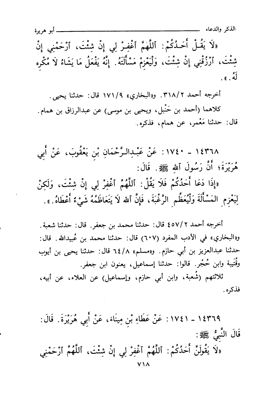 لَا يَقُلْ أَحَدُكُمُ: اللَّهُمَّ اغْفِرْ لِي إِنْ شِئْتَ، ارْحَمْنِي إِنْ شِئْتَ، ارْزُقْنِي إِنْ شِئْتَ، وَلْيَعْزِمْ مَسْأَلَتَهُ، إِنَّهُ يَفْعَلُ مَا يَشَاءُ، لَا مُكْرِهَ لَهُ.