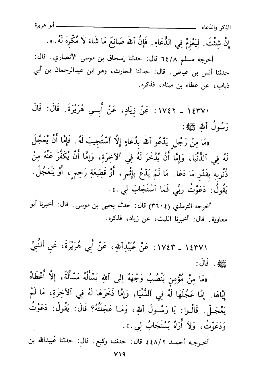 مَا مِنْ رَجُلٍ يَدْعُو اللهَ بِدُعَاءٍ إِلَاّ اسْتُجِيبَ لَهُ، فَإِمَّا أَنْ يُعَجَّلَ لَهُ فِي الدُّنْيَا، وَإِمَّا أَنْ يُدَّخَرَ لَهُ فِي الآخِرَةِ، وَإِمَّا أَنْ يُكَفَّرَ عَنْهُ مِنْ ذُنُوبِهِ بِقَدْرِ مَا دَعَا، مَا لَمْ يَدْعُ بِإِثْمٍ، أَوْ قَطِيعَةِ رَحِمٍ، أَوْ يَسْتَعْجِلُ، قَالُوا: يَا رَسُولَ اللهِ، وَكَيْفَ يَسْتَعْجِلُ؟ قَالَ: يَقُولُ: دَعَوْتُ رَبِّي فَمَا اسْتَجَابَ لِي.