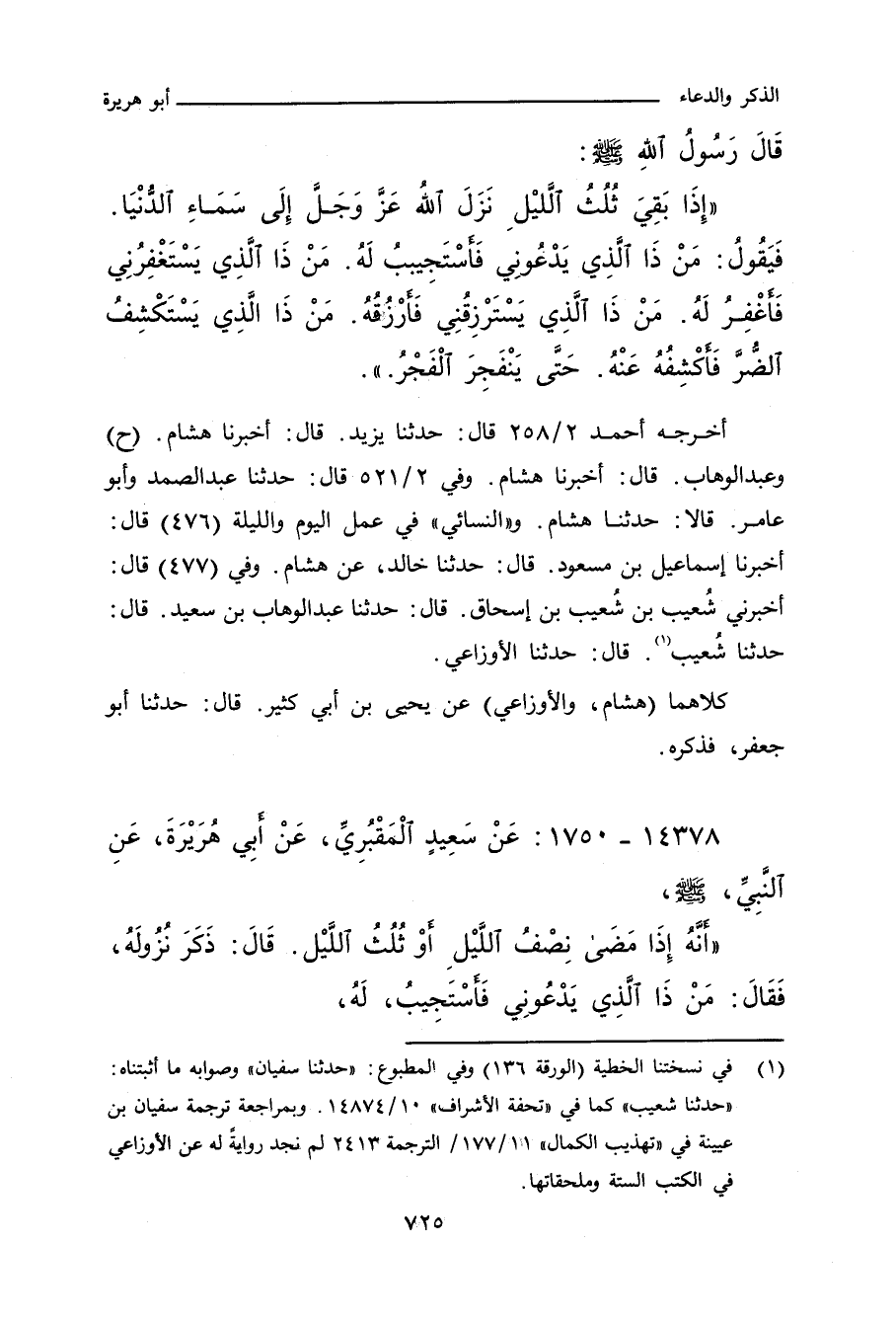 إِذَا بَقِيَ ثُلُثُ اللَّيْلِ يَنْزِلُ اللهُ، عَزَّ وَجَلَّ، إِلَى سَمَاءِ الدُّنْيَا، فَيَقُولُ: مَنْ ذَا الَّذِي يَدْعُونِي فَأَسْتَجِيبَ لَهُ؟ مَنْ ذَا الَّذِي يَسْتَغْفِرُنِي فَأَغْفِرَ لَهُ؟ مَنْ ذَا الَّذِي يَسْتَرْزِقُنِي فَأَرْزُقَهُ؟ مَنْ ذَا الَّذِي يَسْتَكْشِفُ الضُّرَّ فَأَكْشِفَهُ عَنْهُ؟ حَتَّى يَنْفَجِرَ الْفَجْرُ.
