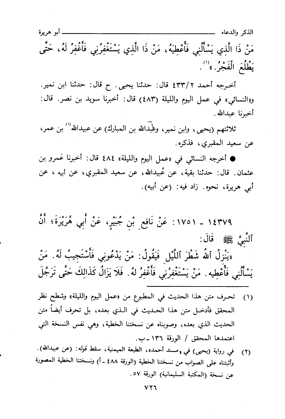 أخرجه أحمد ٢/ ٤٣٣ (٩٥٩٠) قَالَ: حدثنا يحيى. ح قَالَ: حدثنا ابن نمير. و"النَّسائي" في عمل اليوم والليلة (٤٨٣) قَالَ: أخبرنا سويد بن نصر. قَالَ: أخبرنا عبد الله.