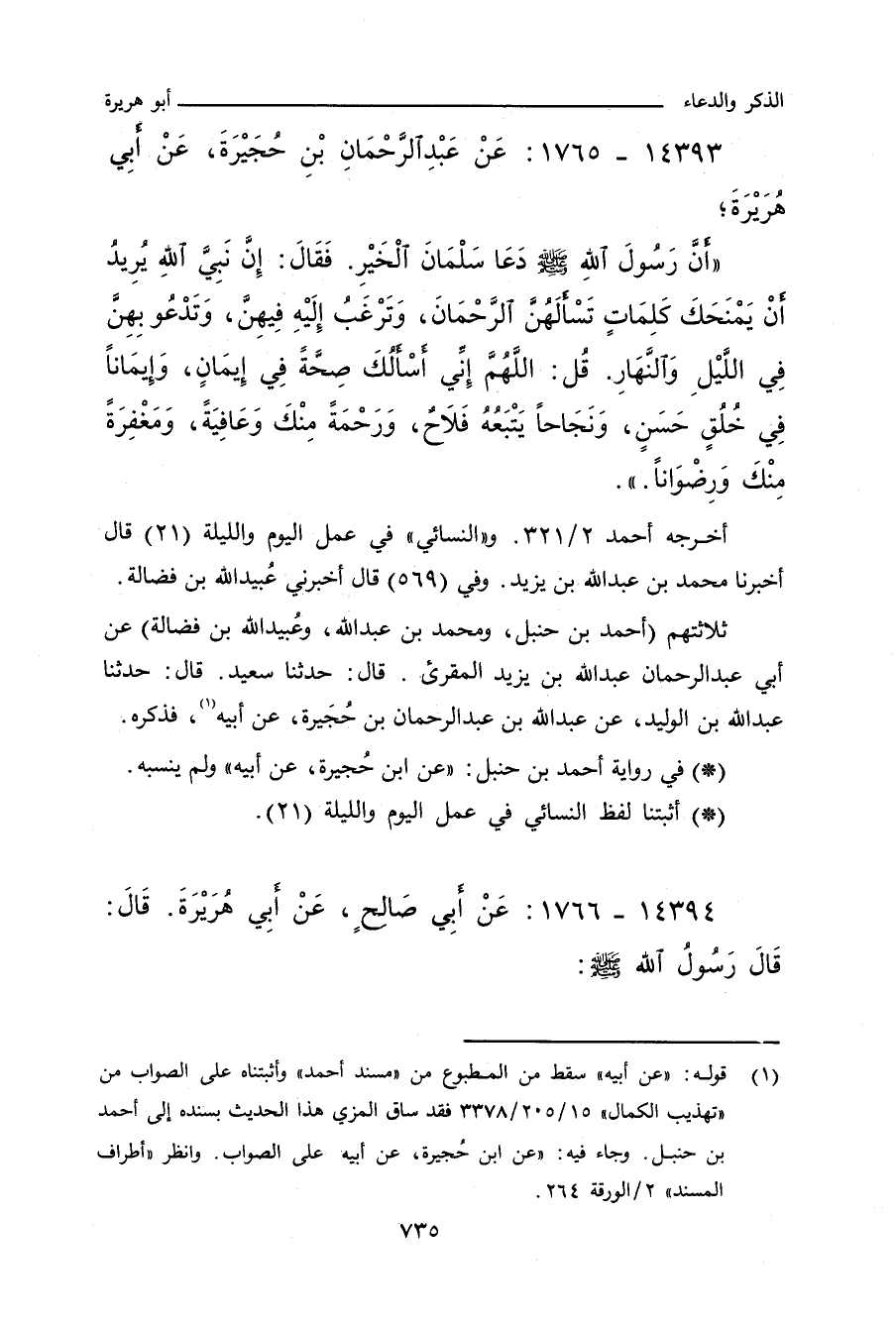أَنَّ رَسُولَ اللهِ صلى الله عليه وسلم دَعَا سَلْمَانَ الْخَيْرِ، فَقَالَ: إِنَّ نَبِيَّ اللهِ يُرِيدُ أَنْ يَمْنَحَكَ كَلِمَاتٍ تَسْأَلُهُنَّ الرَّحْمَانَ وَتَرْغَبُ إِلَيْهِ فِيهِنَّ، وَتَدْعُو بِهِنَّ فِي اللَّيْلِ وَالنَّهَارِ، قُلِ: اللَّهُمَّ إِنِّي أَسْأَلُكَ صِحَّةً فِي إِيمَانٍ، وَإِيمَانًا فِي خُلُقٍ حَسَنٍ، وَنَجَاحًا يَتْبَعُهُ فَلَاحٌ، وَرَحْمَةٌ مِنْكَ وَعَافِيَةً، وَمَغْفِرَةً مِنْكَ وَرِضْوَانًا.