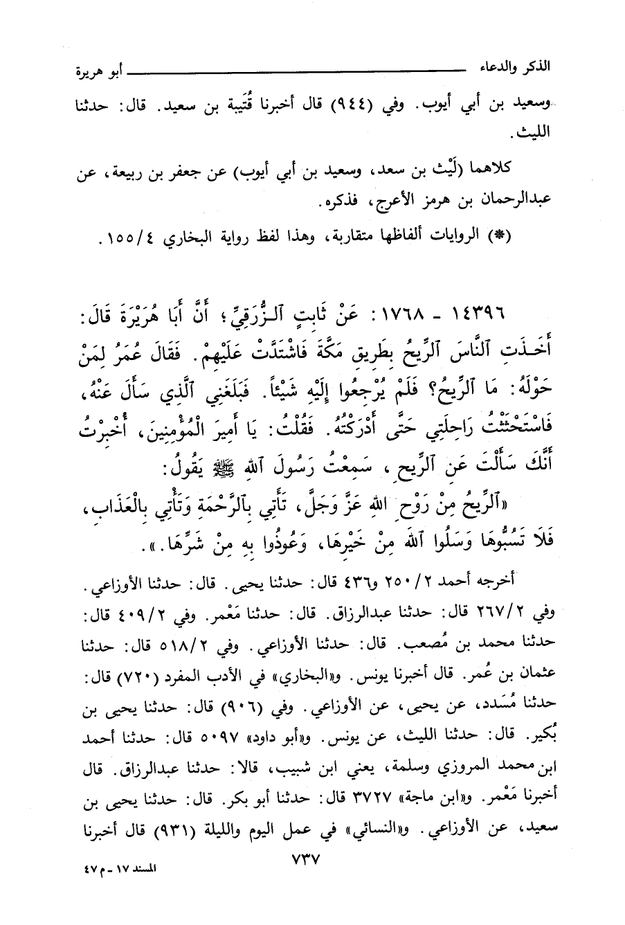 ١٤٣٩٦ - عَنْ ثَابِتٍ الزُّرَقِيِّ، أَنَّ أَبَا هُرَيْرَةَ قَالَ: أَخَذَتِ النَّاسَ الرِّيحُ بِطَرِيقِ مَكَّةَ فَاشْتَدَّتْ عَلَيْهِمْ، فَقَالَ عُمَرُ لِمَنْ حَوْلَهُ: مَا الرِّيحُ؟ فَلَمْ يَرْجِعُوا إِلَيْهِ شَيْئًا، فَبَلَغَنِي الَّذِي سَأَلَ عَنْهُ، فَاسْتَحْثَثْتُ رَاحِلَتِي حَتَّى أَدْرَكْتُهُ، فَقُلْتُ: يَا أَمِيرَ الْمُؤْمِنِينَ، أُخْبِرْتُ أَنَّكَ سَأَلْتَ عَنِ الرِّيحِ سَمِعْتُ رَسُولَ اللهِ صلى الله عليه وسلم يَقُولُ: