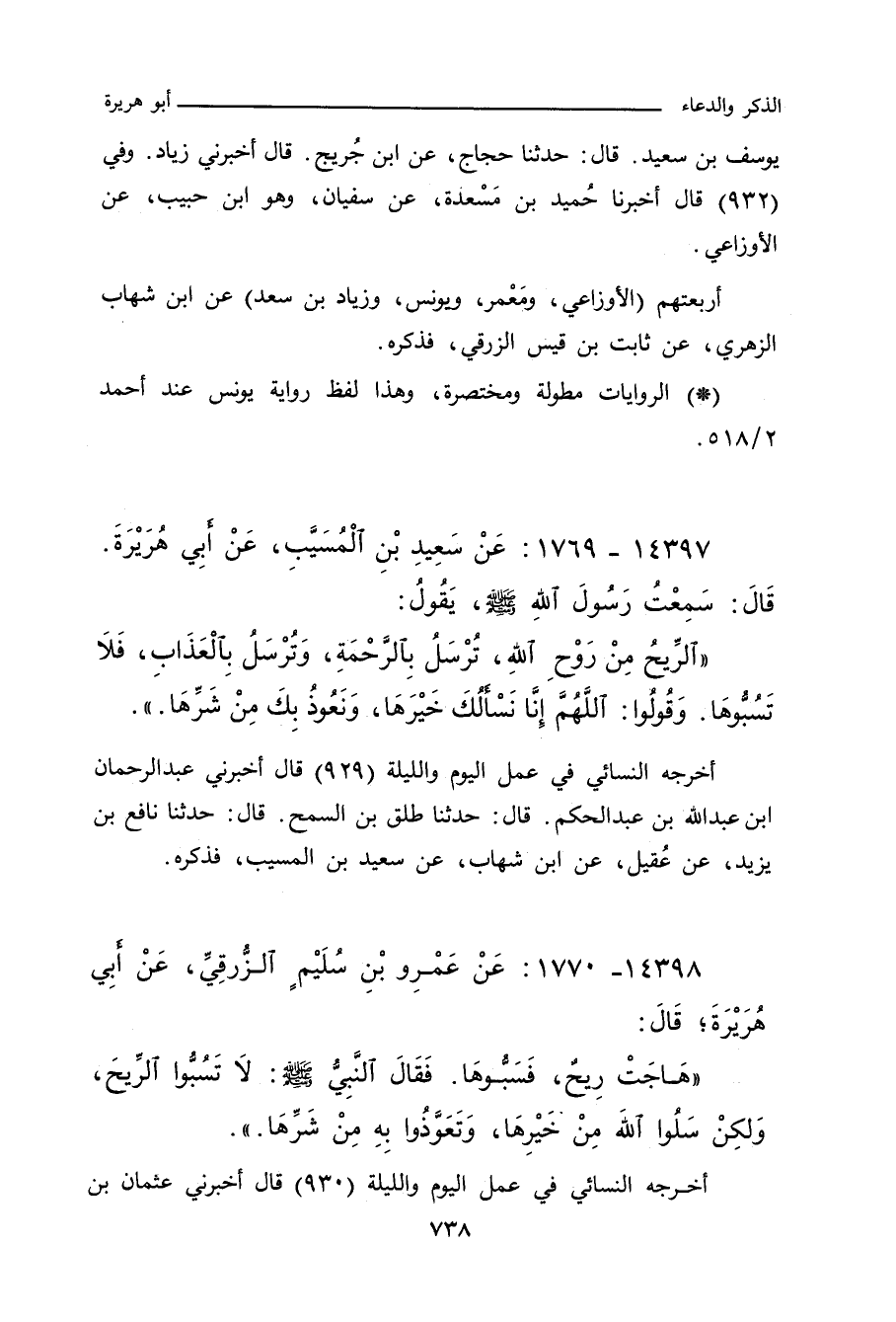 الرِّيحُ مِنْ رَوْحِ اللهِ، تُرْسَلُ بِالرَّحْمَةِ، وَتُرْسَلُ بِالْعَذَابِ، فَلا تَسُبُّوهَا، وَقُولُوا: اللَّهُمَّ إِنَّا نَسْأَلُكَ خَيْرَهَا، وَنَعُوذُ بِكَ مِنْ شَرِّهَا.