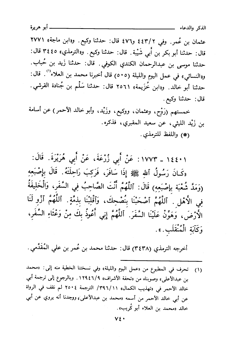 - لفظ النَّسائي: كَانَ رَسُولُ اللهِ صلى الله عليه وسلم إِذَا سَافَرَ، فَرَكِبَ رَاحِلَتَهُ، قَالَ بِإِصْبَعِهِ - وَمَدَّ شُعْبَةُ بِإِصْبَعِهِ - قَالَ: اللَّهُمَّ أَنْتَ الصَّاحِبُ فِي السَّفَرِ، وَالْخَلِيفَةُ فِي الأَهْلِ وَالْمَالِ، اللَّهُمَّ إِنِّي أَعُوذُ بِكَ مِنْ وَعْثَاءِ السَّفَرِ، وَكَآبَةِ الْمُنْقَلَبِ.