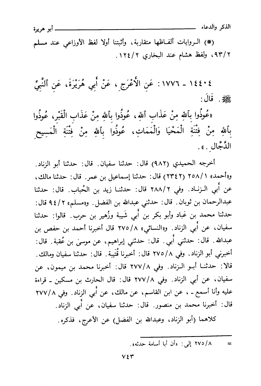 أخرجه الحميدي (٩٨٢) قال: حدَّثنا سفيان، قال: حدَّثنا أبو الزناد. و"أحمد" ١/ ٢٥٨ (٢٣٤٢) قال: حدَّثنا إسماعيل بن عمر، قال: حدَّثنا مالك، عن أبي الزناد. وفي ٢/ ٢٨٨ (٧٨٥٧) قال: حدَّثنا زيد بن الحباب، حدَّثنا عبد الرحمن بن ثويان، حدثني عبد الله بن الفضل. و"مسلم" ١٢٧٠ قال: حدَّثنا محمد بن عَبَّاد، وأبو بكر بن أبي شَيْبَة، وزُهير بن حرب، قالوا: حدثنا سفيان، عن أبي الزناد. و"النَّسائي" ٨/ ٢٧٥، وفي "الكبرى" ٧٨٨٩ قال: أخبرنا أحمد بن حفص بن عبد الله، قال: حدثني أبي، قال: حدثني إبراهيم، عن موسى بن عُقبة، أخبرني أبو الزناد. وفي ٨/ ٢٧٥ قال: أخبرنا قُتَيبة، قال: حدَّثنا سفيان، ومالك، قالا: حدثنا أبو الزناد. وفي ٨/ ٢٧٧، وفي "الكبرى" ٧٨٩٧ قال: أخبرنا محمد بن ميمون، عن سفيان، عن أبي الزناد. وفي ٨/ ٢٧٧، وفي "الكبرى" ٧٨٩٨ قال: قال الحارث بن مسكين، قراءة عليه وأنا أسمع، عن ابن القاسم، عن مالك، عن أبي الزناد. وفي ٨/ ٢٧٧، وفي "الكبرى" ٧٩٠٢ قال: أخبرنا محمد بن منصور، قال: حدَّثنا سفيان، عن أبي الزناد. وفي "الكبرى" ٧٦٧٥ و ٧٨٩٢ قال: أخبرنا قُتَيْبَة بن سَعِيد، قال: حدَّثنا سُفْيَان، قال: حدَّثنا أبو الزِّنَاد. و"أبو يَعْلَى" ٦٢٧٩ قال: حدَّثنا أبو خَيْثَمَة، حدَّثنا سُفْيَان، عن أبي الزِّنَاد.