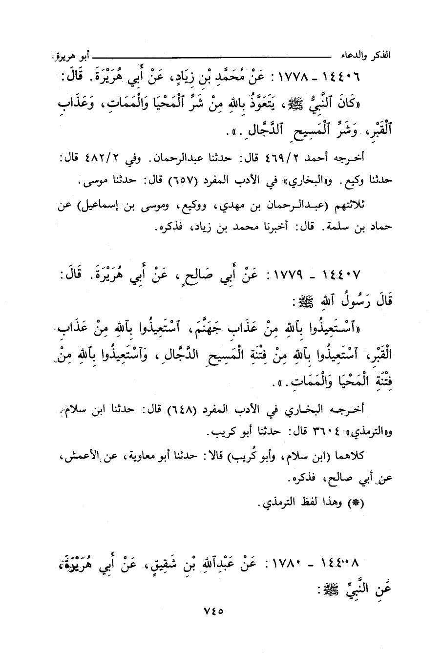 - وفي رواية: كَانَ النَّبِيُّ صلى الله عليه وسلم يَتَعَوَّذُ بِاللهِ مِنْ شَرِّ الْمَحْيَا وَالْمَمَاتِ، وَعَذَابِ الْقَبْرِ، وَشَرِّ الْمَسِيحِ الدَّجَّالِ.