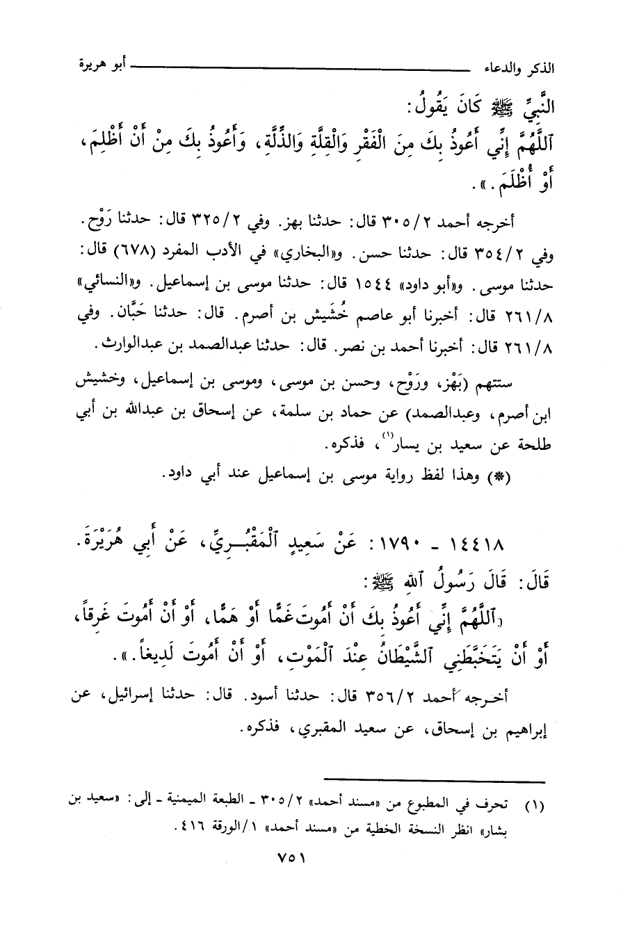 اللَّهُمَّ إِنِّي أَعُوذُ بِكَ مِنَ الْفَقْرِ، وَالْقِلَّةِ، وَالذِّلَّةِ، وَأَعُوذُ بِكَ أَنْ أَظْلِمَ، أَوْ أُظْلَمَ.