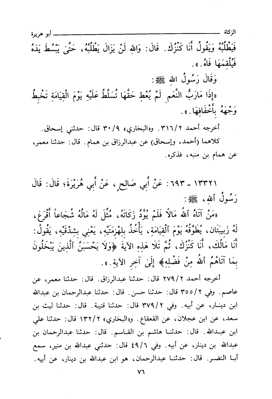 ـ وفي رواية: يَكُونُ كَنْزُ أَحَدِهِمْ يَوْمَ الْقِيَامَةِ شُجَاعًا أَقْرَعَ، ذَا زَبِيبَتَيْنِ، يَتْبَعُ صَاحِبَهُ، وَهُوَ يَتَعَوَّذُ مِنْهُ، وَلَا يَزَالُ يَتْبَعُهُ حَتَّى يُلْقِمَهُ أُصْبُعَهُ.