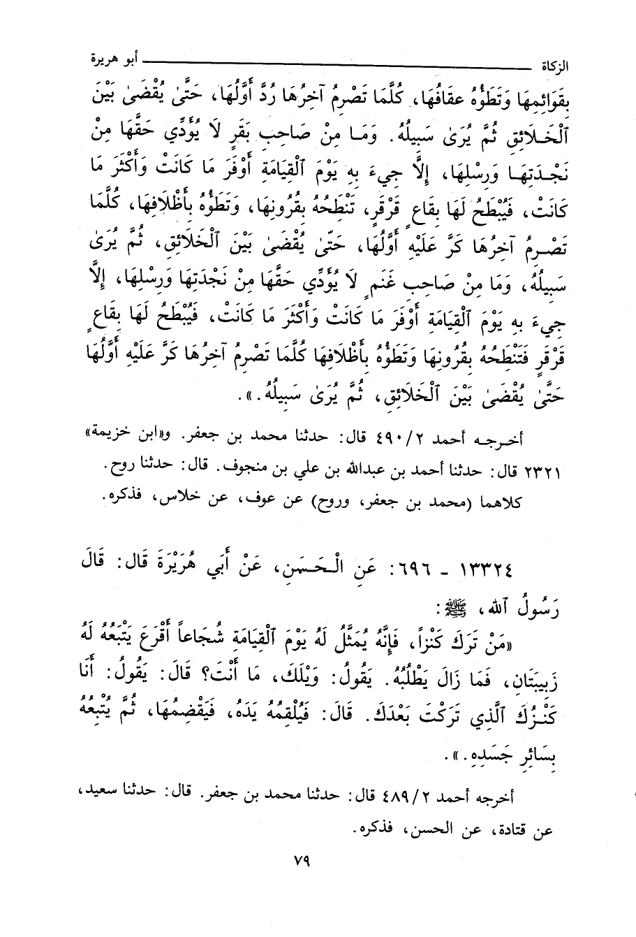 بقَوَائِمِهَا، وَتَطَؤُهُ عِقَافُهَا، كُلَّمَا تَصْرِمُ آخِرُهَا رُدَّ أَؤَّلُهَا، حَتَّى يُقْضَى بَيْنَ الْخَلَائِقِ، ثُمَّ يُرَى سَبِيلُهُ، وَمَا مِنْ صَاحِبِ بَقَرٍ لَا يُؤَدِّي حَقَّهَا مِنْ نَجْدَتِهَا وَرِسْلِهَا، إِلَاّ جِيءَ بِهِ يَوْمَ الْقِيَامَةِ أَوْفَرَ مَا كَانَتْ وَأَكْثَرَ مَا كَانَتْ، فَيُبْطَحُ لَهَا بِقَاعٍ قَرْقَرٍ، َ تَنْطِحُهُ بِقُرُونِهَا، وَتَطَؤُهُ بِأَظْلَافِهَا، كُلَّمَا تََصْرِمُ آخِرُهَا كَرَّ عَلَيْهِ أَوَّلُهَا، حَتَّى يُقْضَى بَيْنَ الْخَلَائِقِ، ثُمَّ يُرَى سَبِيلُهُ، وَمَا مِنْ صَاحِبِ غَنَمٍ لَا يُؤَدِّي حَقَّهَا مِنْ نَجْدَتِهَا وَرِسْلِهَا، إِلَاّ جِيءَ بِهِ يَوْمَ الْقِيَامَةِ أَوْفَرَ مَا كَانَتْ وَأَكْثَرَ مَا كَانَتْ، فَيُبْطَحُ لَهَا بِقَاعٍ قَرْقَرٍ، فَتَنْطَحُهُ بِقُرُونِهَا وَتَطَؤُهُ بِأَظْلَافِهَا، كُلَّمَا تَصْرِمُ آخِرُهَا كَرَّ عَلَيْهِ أَوَّلُهَا، حَتَّى يُقْضَى بَيْنَ الْخَلَائِقِ، ثُمَّ يُرَى سَبِيلَُهُ.
