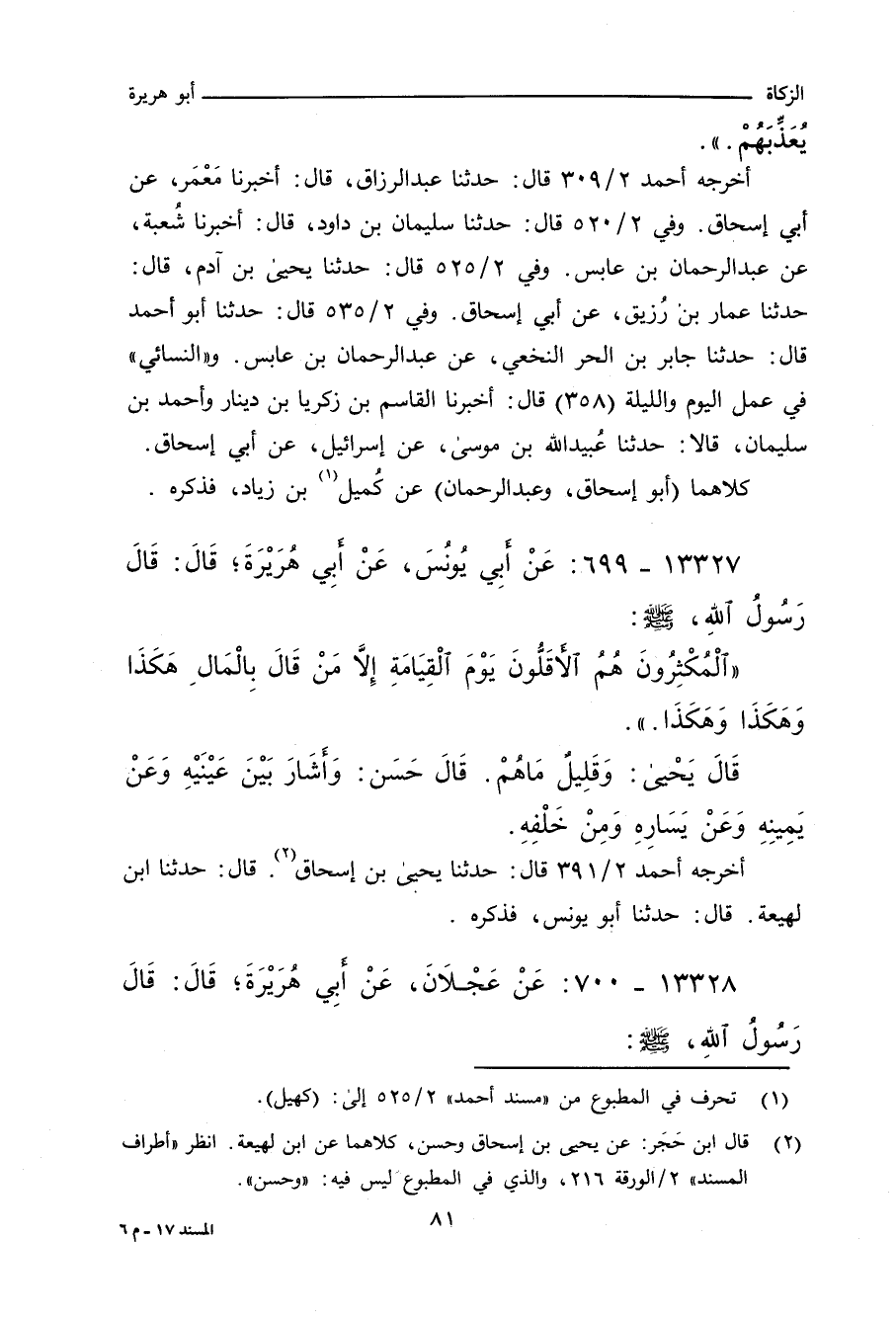 ـ وفي رواية: خَرَجَ رَسُولُ اللهِ صلى الله عليه وسلم فِي نَخْلِ الْمَدِينَةِ، فَقَالَ: يَا أَبَا هُرَيْرَةَ، أَوْ يَا أَبَا هِرٍّ، هَلَكَ الْمُكْثِرُونَ، إِنَّ الْمُكْثِرِينَ الأَقَلُّونَ يَوْمَ الْقِيَامَةِ، إِلَاّ مَنْ قَالَ بِالْمَالِ: هَكَذَا وَهَكَذَا، وَقَلِيلٌ مَا هُمْ يَا أَبَا هُرَيْرَةَ، أَلَا أَدُلُّكَ عَلَى كَنْزٍ مِنْ كُنُوزِ الْجَنَّةِ؟ لَا حَوْلَ وَلَا قُوَّةَ إِلَاّ بِاللهِ، وَلَا مَلْجَأَ مِنَ اللهِ إِلَاّ إِلَيْهِ، يَا أَبَا هُرَيْرَةَ، هَلْ تَدْرِى مَا حَقُّ اللهِ عَلَى الْعِبَادِ، وَمَا حَقُّ الْعِبَادِ عَلَى اللهِ، قَالَ: قُلْتُ: اللهُ وَرَسُولُهُ أَعْلَمُ، قَالَ: فَإِنَّ حَقَّ اللهِ عَلَى الْعِبَادِ أَنْ يَعْبُدُوهُ وَلَا يُشْرِكُوا بِهِ شَيْئًا، وَإِنَّ حَقَّ الْعِبَادِ عَلَى اللهِ أَنْ لَا يُعَذِّبَ مَنْ فَعَلَ ذَلِكَ مِنْهُمْ.