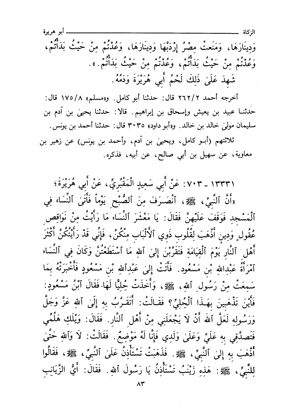 أَنَّ النَّبِيَّ صلى الله عليه وسلم انْصَرَفَ مِنَ الصُّبْحِ يَوْمًا، فَأَتَى النِّسَاءَ فِي الْمَسْجِدِ فَوَقَفَ عَلَيْهِنَّ، فَقَالَ: يَا مَعْشَرَ النِّسَاءِ، مَا رَأَيْتُ مِنْ نَوَاقِصِ عُقُولٍ وَدِينٍ أَذْهَبَ لِقُلُوبِ ذَوِي الأَلْبَابِ مِنْكُنَّ، فَإِنِّي قَدْ رَأَيْتُكُنَّ أَكْثَرَ أَهْلِ النَّارِ يَوْمَ الْقِيَامَةِ، فَتَقَّرَبْنَ إِلَى اللهِ مَا اسْتَطَعْتُنَ، وَكَانَ فِي النِّسَاءِ امْرَأَةُ عَبْدِ اللهِ بْنِ مَسْعُودٍ، فَأَتَتْ إِلَى عَبْدِ اللهِ بْنِ مَسْعُودٍ فَأَخْبَرَتْهُ بِمَا سَمِعَتْ مِنْ رَسُولِ اللهِ صلى الله عليه وسلم، وَأَخَذَتْ حُلِيًّا لَهَا، فَقَالَ ابْنُ مَسْعُودٍ: فَأَيْنَ تَذْهَبِينَ بِهَذَا الْحُلِيِّ؟ فَقَالَتْ: أَتَقَرَّبُ بِهِ إِلَى اللهِ، عَزَّ وَجَلَّ، وَرَسُولِهِ، لَعَلَّ اللهَ أَلَاّ يَجْعَلَنِي مِنْ أَهْلِ النَّارِ، فَقَالَ: وَيْلَكِ، هَلُمِّي فَتَصَدَّقِي بِهِ عَلَيَّ وَعَلَى وَلَدِي فَإِنَّا لَهُ مَوْضِعٌ، فَقَالَتْ: لَا وَاللهِ، حَتَّى أَذْهَبَ بِهِ إِلَى النَّبِيِّ صلى الله عليه وسلم، فَذَهَبَتْ تَسْتَأْذِنُ عَلَى النَّبِيِّ صلى الله عليه وسلم، فَقَالُوا لِلنَّبِيِّ صلى الله عليه وسلم: هَذِهِ زَيْنَبُ تَسْتَأْذِنُ يَا رَسُولَ اللهِ، فَقَالَ: أَيُّ الزَّيَانِبِ