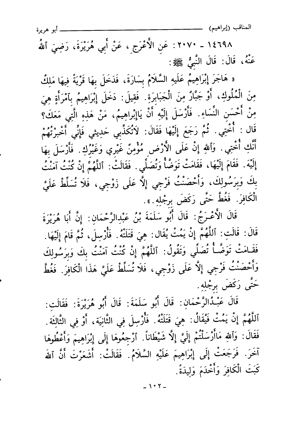 هَاجَرَ إِبْرَاهِيمُ عَلَيهِ السَّلَامُ بِسَارَةَ، فَدَخَلَ بِهَا قَرْيَةً فِيهَا مَلِك مِنَ الْمًلُوكِ، أوْ جَبَّارٌ مِنَ الْجَبَابِرَةِ. فَقِيلَ: دَخَلَ إِبْرَاهِيمُ بِامْرَأةٍ هِيَ مِنْ أحْسَنِ النِّسَاءِ. فَأرْسَلَ إِلَيْهِ أنْ يَا إِبْراهِيمُ، مَنْ هَذِهِ الَّتِي مَعَكَ؛ قَال: أخْتِي. ثُمَّ رَجَعَ إِلَيْهَا فَقَالَ: لَاتُكَذِّبِي حَدِيثي فَإِنِّي أَخْبرْتُهُمْ أنَّكِ أخْتِي. وَاللهِ إِنْ عَلَى الأرْضِ مُؤمِنٌ غَيْرِي وَغَيْرُكِ. فَأرْسَلَ بِهَا إِلَيْهَ. فَقَامَ إِلَيْهَا، فَقَامَتْ تَوَضَّأ وَتُصَلِّي. فَقَالَتْ: اللهمِّ إِنْ كُنْتُ آمَنْتُ بِكَ وَبِرَسُولِكَ، وَأحْصَنْتُ فَرْجِي إِلَاّ عَلَى زَوْجِي، فَلَا تُسَلِّطْ عَلَيَّ الْكَافِر. فَغُطَّ حَتَّى رَكَضَ برِجْلِهِ.