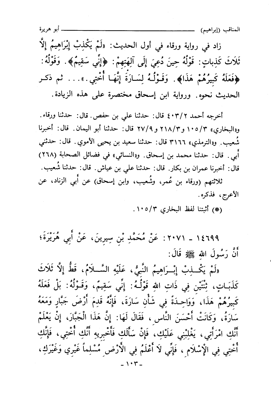 لَمْ يَكْذِبْ إِبْرَاهِيمُ إِلَاّ ثَلَاثَ كَذِباتٍ: قَوْلُهُ حِينَ دُعِيَ إِلَى آلهتهم: ?إِنِّي سَقِيمٌ?. وَقَوْلُهُ: ?فَعَلَهُ كَبِيرُهُمْ هَذَا?. وَقَوْلُهُ لِسَارَةَ إِنَّهَا أخْتِي. . . ثم ذكر الحديث نحوه. ورواية ابن إسحاق مختصرة على هذه الزيادة.