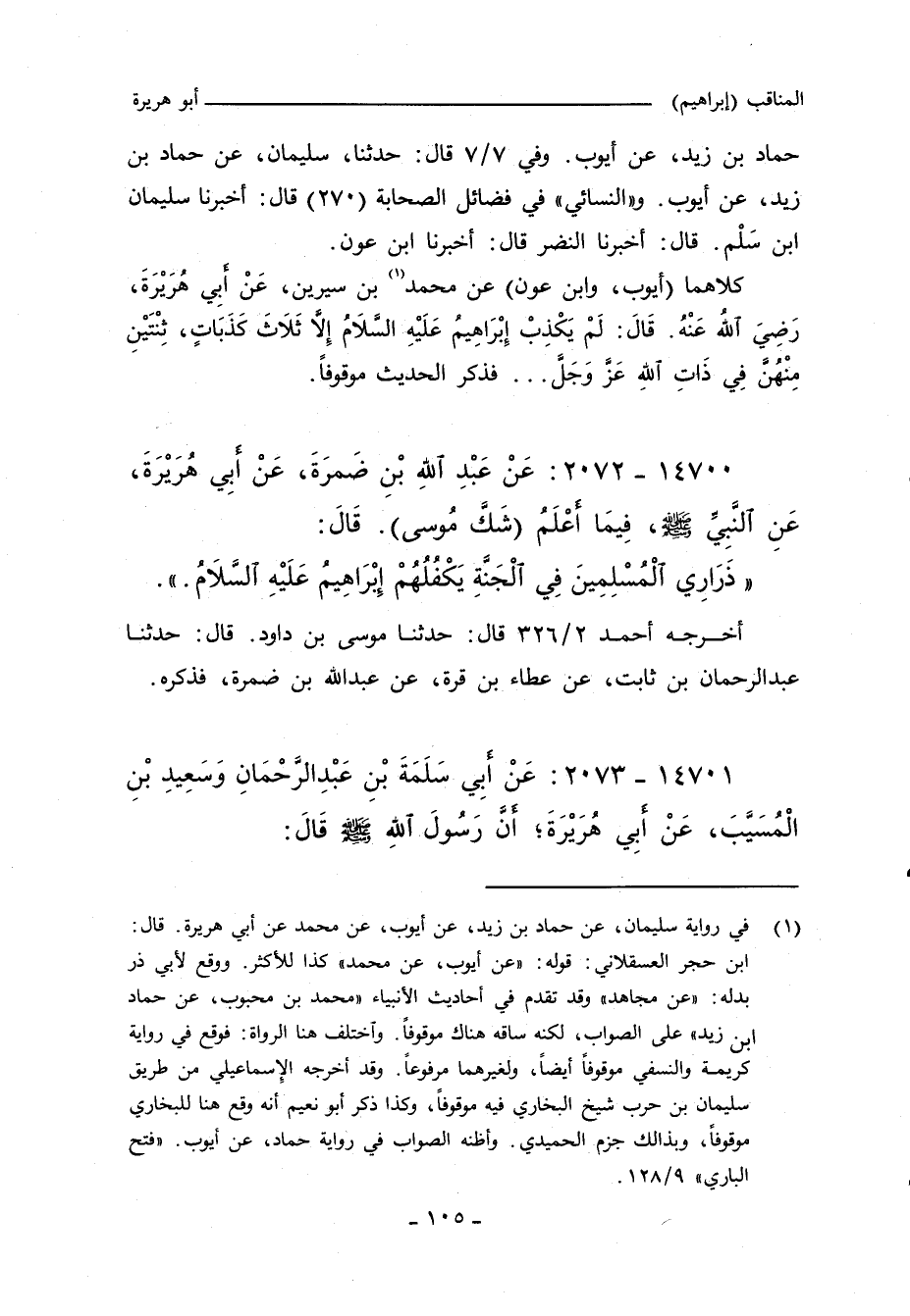 كلاهما (أيوب، وابن عون) عن محمد بن سيرين، عَنْ أَبِي هُرَيْرَةَ، رَضِيَ الله عَنْهُ , قال: لَمْ يَكْذِبْ إِبْرَاهِيمُ عَلَيْهِ السَّلامُ إِلا ثَلاثَ كَذَبَاتٍ، ثِنْتَيْنِ مِنْهُنِّ فِي ذَاتِ الله عَزَّ وَجَلَّ. . . فذكر الحديث موقوفًا.