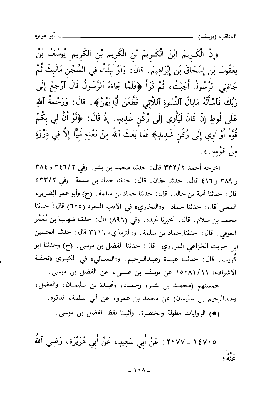 إِنَّ الْكَرِيمَ ابْنَ الْكَرِيمَ بْنِ الْكَرِيم بْنِ الْكَرِيمِ يُوسُفُ بْنُ يَعْقُوبَ بْنِ إِسْحَاقَ بْنِ إِبْرَاهِيمَ , قال: وَلَوْ لَبِثْتُ فِي السِّجْنِ مَالَبِثَ ثُمَ جَاءَنِي الرَّسُولُ أَجَبْتُما، ثُمَّ قَرَأ ?فَلَمَّا جَاءَهُ الرَّسُولُ قَالَ ارْجِعْ إِلَى رَبَّكَ فَاسْألْهُ مَابَالُ النِّسْوَةِ اللَاتي قَطَّعْنَ أيْدِيَهُنَّ? , قال: وَرَحْمَةُ اللهِّ عَلَى لُوطٍ إِنْ كَانَ لَيَأوِي إِلى رُكْنٍ شَدِيدٍ. إِذْ قَالَ: ?لَوْأنَّ لِي بِكُمْ قُوَّةً أوْ آوِي إِلَى رُكْنٍ شَدِيدٍ ? فَمَا بَعَثَ اللَّهُ مِنْ بَعْدِهِ نَبِيًّا إِلَاّ فِي ذِرْوَةٍ مِنْ قَوْمِهِ.