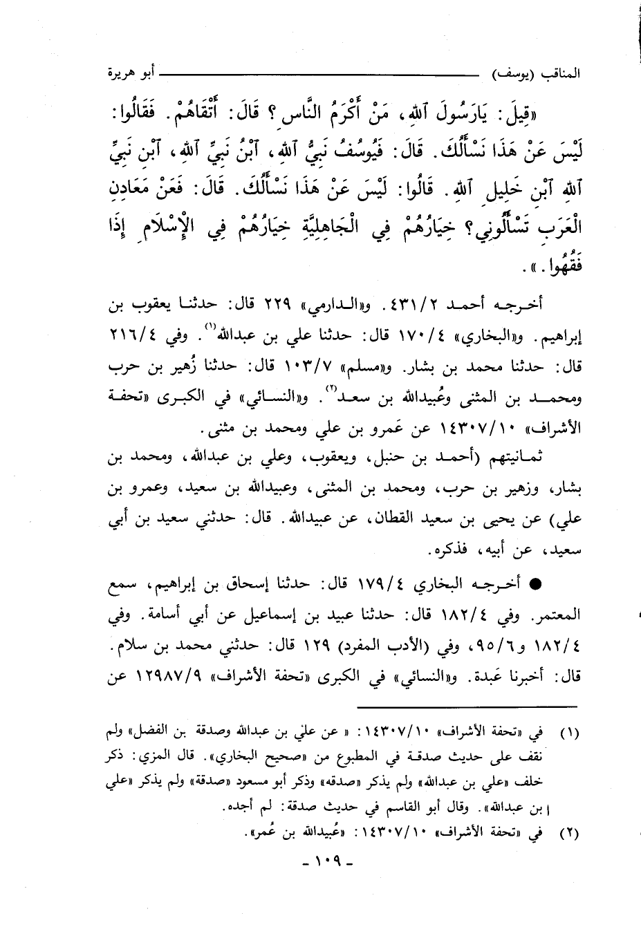قِيلَ: يَارَسُولَ الله، مَنْ أكْرَمُ النَّاسِ؛ قَالَ: أتْقَاهُمْ. فَقَالُوا: لَيْسَ عَنْ هَذَا نَسْألُكَ , قال: فَيُوسُفُ نَبِيُّ الله، ابْنُ نَبِيِّ اللهِ، ابنِ نَبِيِّ الله ابنِ خَلِيلِ الله. قالوا: لَيْسَ عَنْ هَذَا نَسْألُكَ , قال: فَعَنْ مَعَادِنِ الْعَرَبِ تَسْألونِي؛ خِيَارُهُمْ فِي الْجَاهِلِيَّةِ خِيَارُهُمْ فِي الإسْلَامِ إِذَا فَقُهُوا.