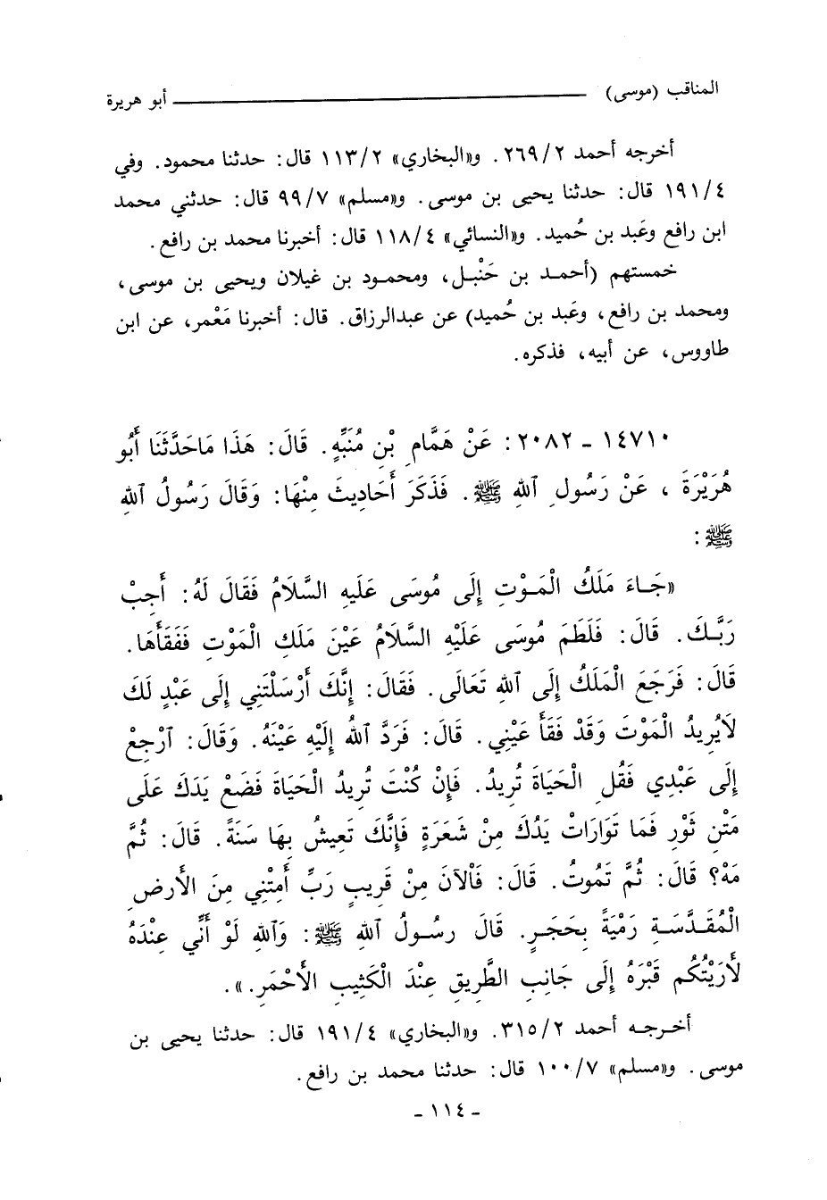 جَاءَ مَلَكُ الْمَوْتِ إِلَى مُوسَى عَلَيْهِ السَّلَامُ فَقَالَ لَهُ أَجِبْ رَبَّكَ - قَالَ - فَلَطَمَ مُوسَى عَلَيْهِ السَّلَامُ عَيْنَ مَلَكِ الْمَوْتِ فَفَقَأَهَا - قَالَ - فَرَجَعَ الْمَلَكُ إِلَى اللهِ تَعَالَى فَقَالَ إِنَّكَ أَرْسَلْتَنِى إِلَى عَبْدٍ لَكَ لَا يُرِيدُ الْمَوْتَ وَقَدْ فَقَأَ عَيْنِى - قَالَ - فَرَدَّ اللَّهُ إِلَيْهِ عَيْنَهُ وَقَالَ ارْجِعْ إِلَى عَبْدِى فَقُلِ الْحَيَاةَ تُرِيدُ فَإِنْ كُنْتَ تُرِيدُ الْحَيَاةَ فَضَعْ يَدَكَ عَلَى مَتْنِ ثَوْرٍ فَمَا تَوَارَتْ يَدُكَ مِنْ شَعْرَةٍ فَإِنَّكَ تَعِيشُ بِهَا سَنَةً قَالَ ثُمَّ مَهْ قَالَ ثُمَّ تَمُوتُ. قَالَ فَالآنَ مِنْ قَرِيبٍ رَبِّ أَمِتْنِى مِنَ الأَرْضِ الْمُقَدَّسَةِ رَمْيَةً بِحَجَرٍ. قَالَ رَسُولُ اللهِ صلى الله عليه وسلم وَاللهِ لَوْ أَنِّى عِنْدَهُ لأَرَيْتُكُمْ قَبْرَهُ إِلَى جَانِبِ الطَّرِيقِ عِنْدَ الْكَثِيبِ الأَحْمَر.