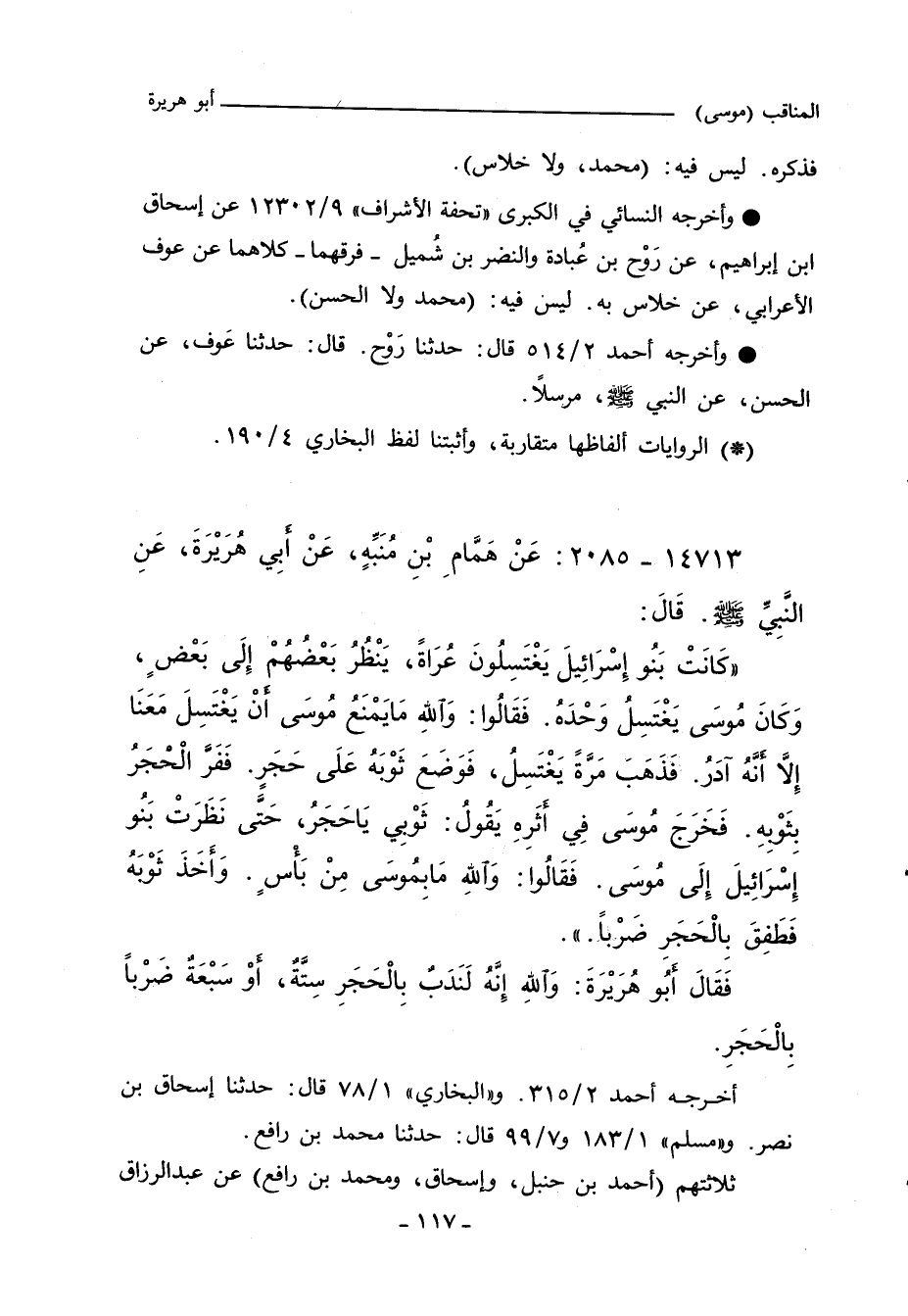كَانَتْ بَنُو إِسْرَائِيلَ يَغْتَسِلُونَ عُرَاةً، يَنْظُرُ بَعْضُهُمْ إِلَى بَعْضٍ، وَكَانَ مُوسَى يَغْتَسِلُ وَحْدَهُ، فَقَالُوا وَاللهِ مَا يَمْنَعُ مُوسَى أَنْ يَغْتَسِلَ مَعَنَا إِلَاّ أَنَّهُ آدَرُ، فَذَهَبَ مَرَّةً يَغْتَسِلُ، فَوَضَعَ ثَوْبَهُ عَلَى حَجَرٍ، فَفَرَّ الْحَجَرُ بِثَوْبِهِ، فَخَرَجَ مُوسَى فِى إِثْرِهِ يَقُولُ ثَوْبِى يَا حَجَرُ. حَتَّى نَظَرَتْ بَنُو إِسْرَائِيلَ إِلَى مُوسَى، فَقَالُوا وَاللهِ مَا بِمُوسَى مِنْ بَأْسٍ. وَأَخَذَ ثَوْبَهُ، فَطَفِقَ بِالْحَجَرِ ضَرْبًا. فَقَالَ أَبُو هُرَيْرَةَ وَاللهِ إِنَّهُ لَنَدَبٌ بِالْحَجَرِ سِتَّةٌ أَوْ سَبْعَةٌ ضَرْبًا بِالْحَجَر.